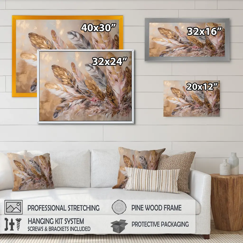Designart "Gold Feather Boho Majesty" Glam Feather Framed Wall Art For Living Room - 40 In. Wide X 30 In. High - Gold
