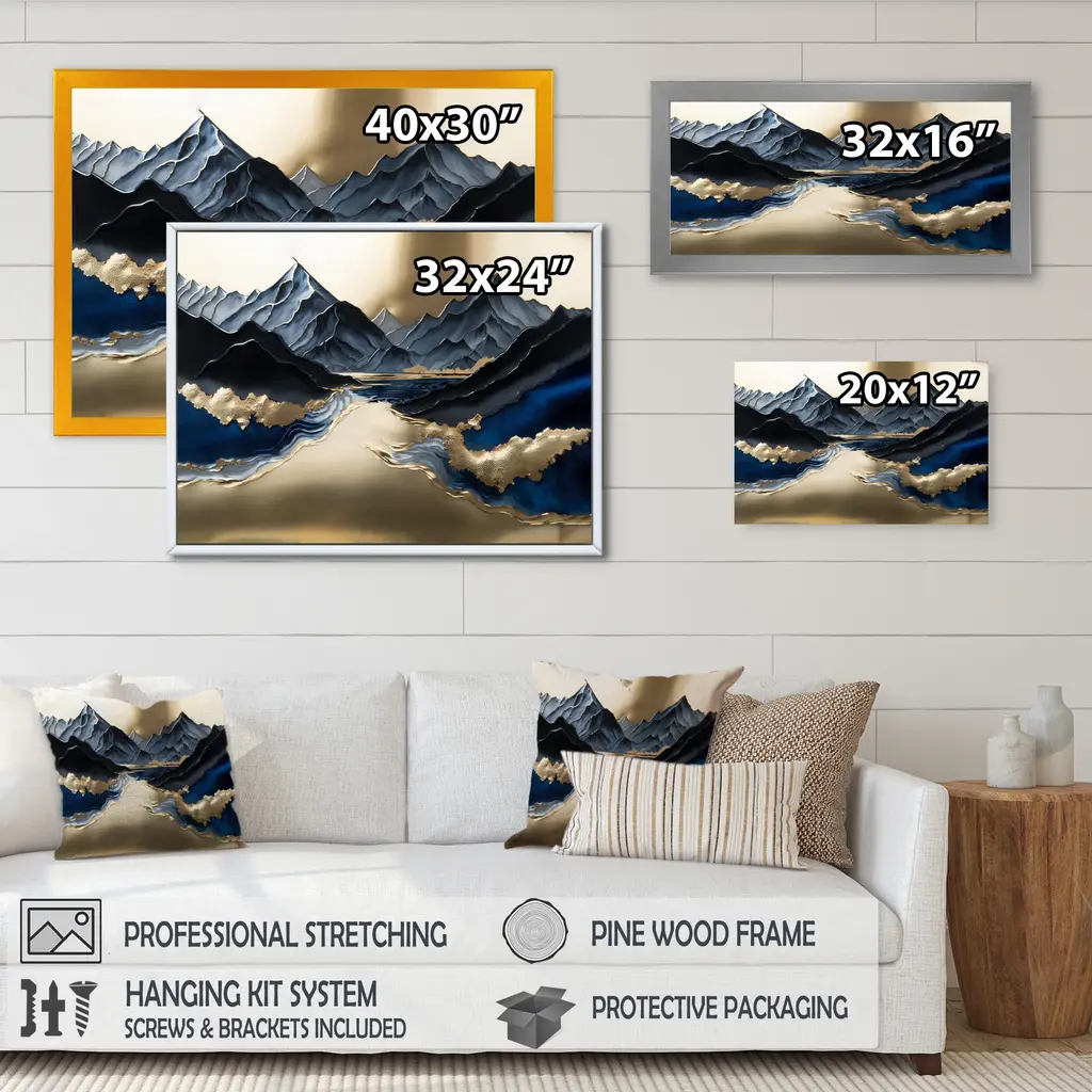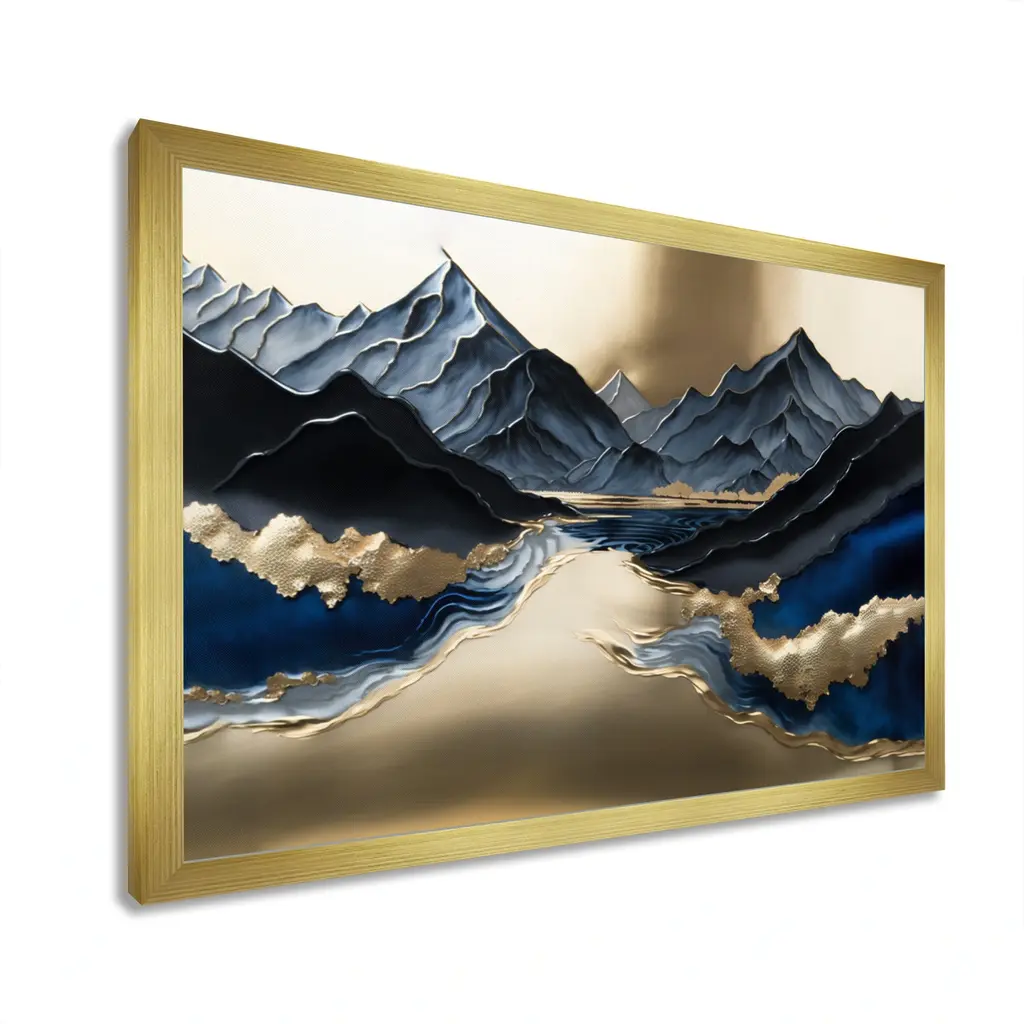 This beautiful 'Golden Mountains And River' Framed wall Art is printed using the highest quality fade-resistant ink on canvas. Every one of our fine art giclee canvas prints is printed on premium quality canvas, using the finest quality inks which will not fade over time, and then mounted and framed on a 1.5 inch wide frame. All of our Framed canvas prints are carefully packaged with corner protection, fragile labeling and sturdy boxes to ensure safe delivery. Every framed canvas print arrives ready to hang on the wall, with the hanging kits included. This framed art print is available in many different color frames. Features: - Style : Traditional, Lake House - Subject : Landscapes, Cottage - Color : Gold, Blue - Premium quality cotton canvas. - Arrives ready to hang on the wall - Frame Tickness : 1 inch - Frame Width : 1.5 inch Wide - Easy to Hang