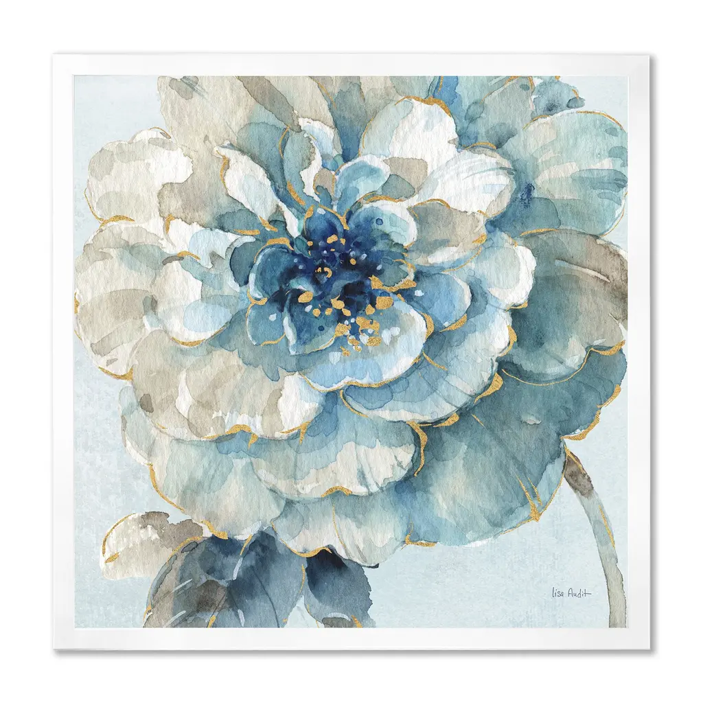 Designart "Indigold Watercolor Flower Ii" Farmhouse Framed Art Print - 16 In. Wide X 16 In. High - Silver