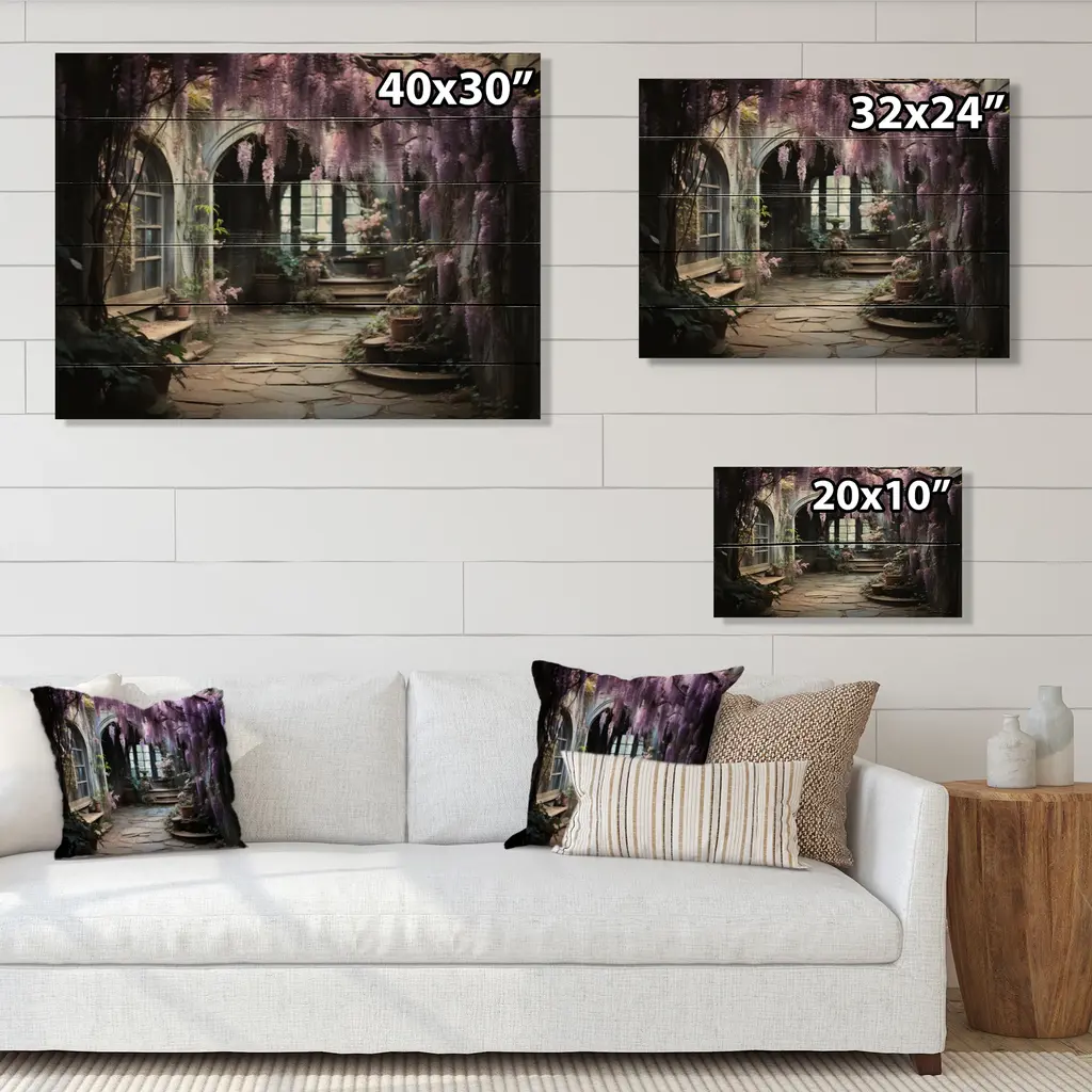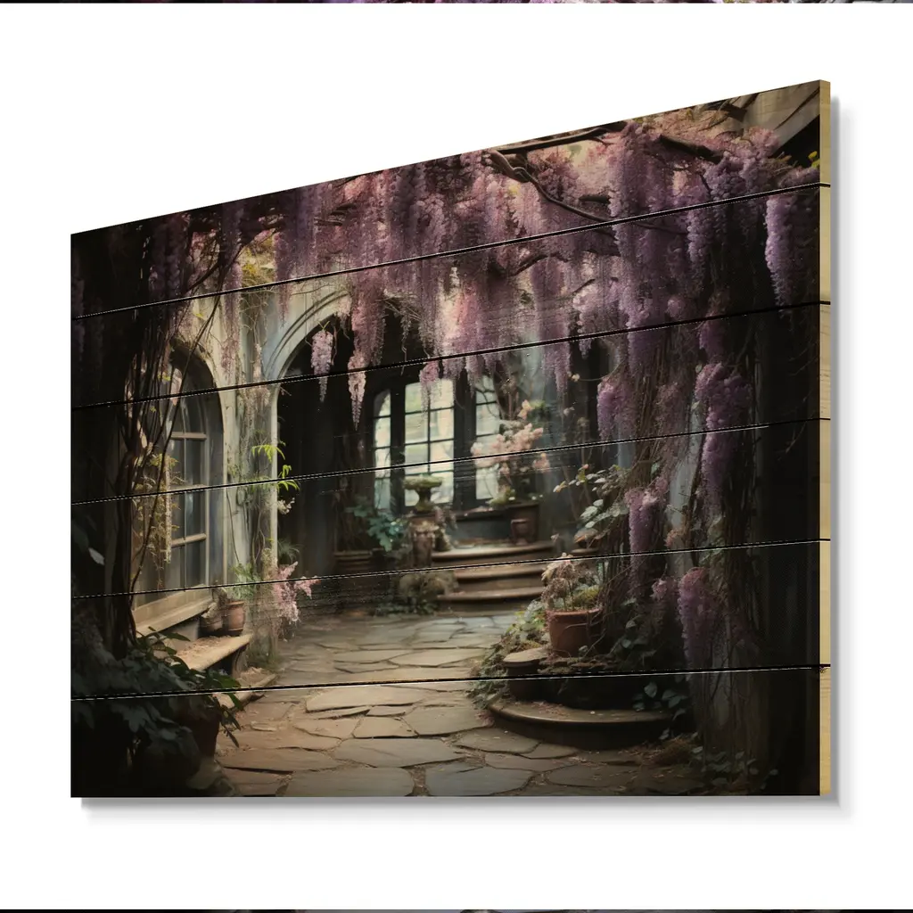 Designart "Japon Art Purple Wisteria Archway Ii" Japanese Print On Natural Pine Wood - 32 In. Wide X 24 In. High