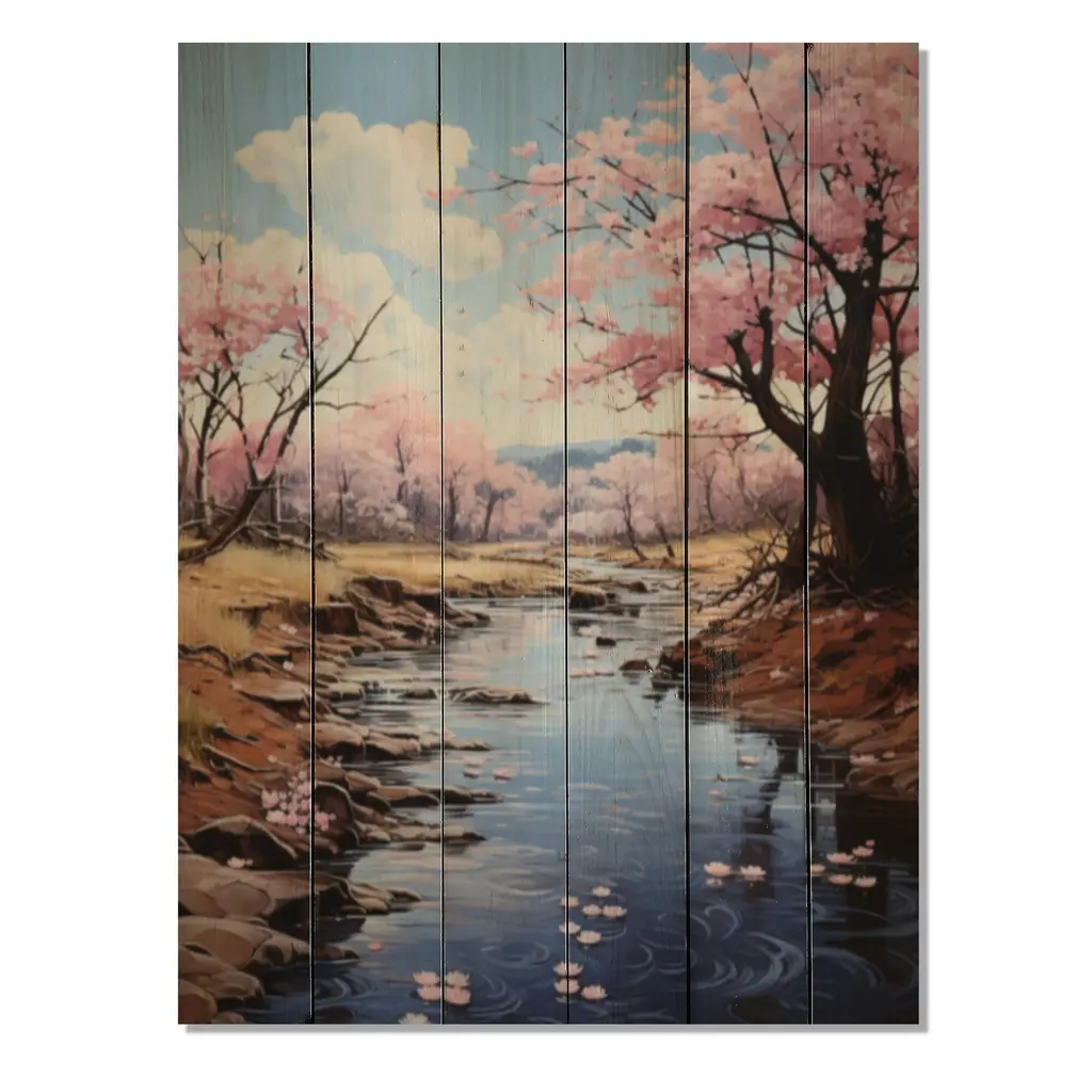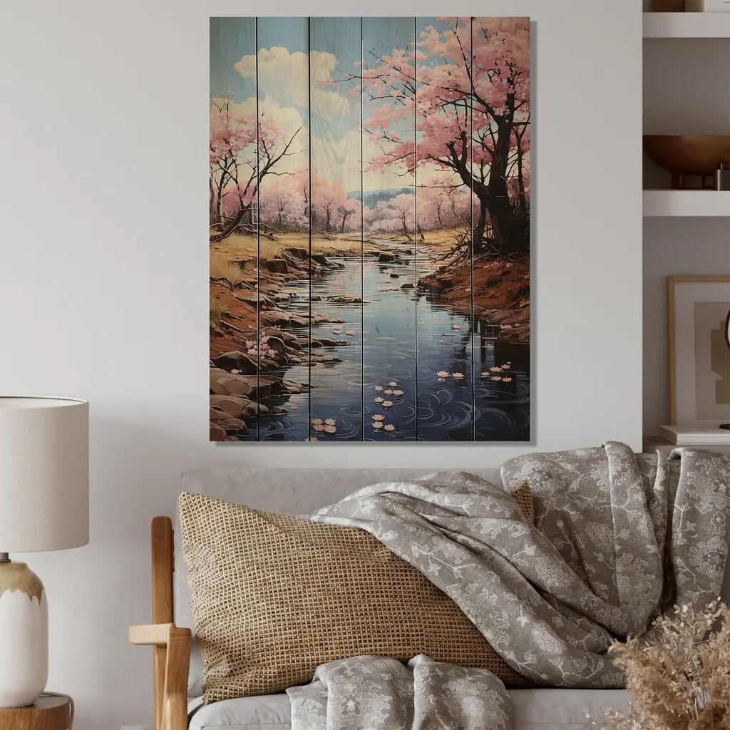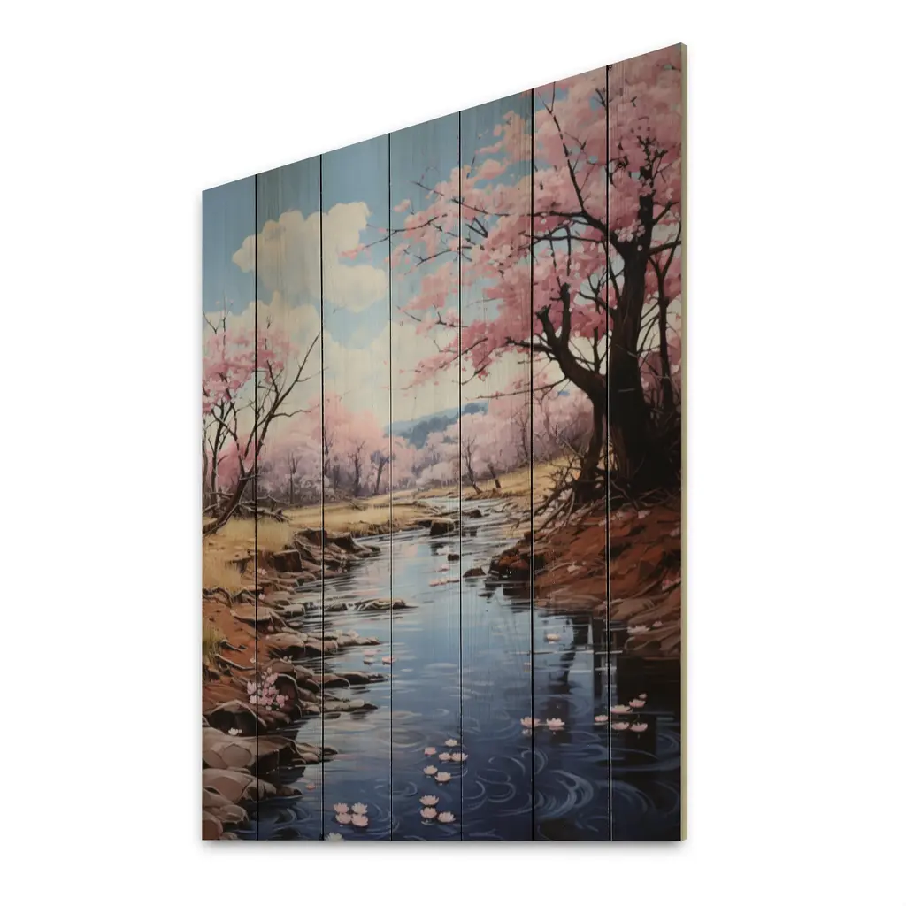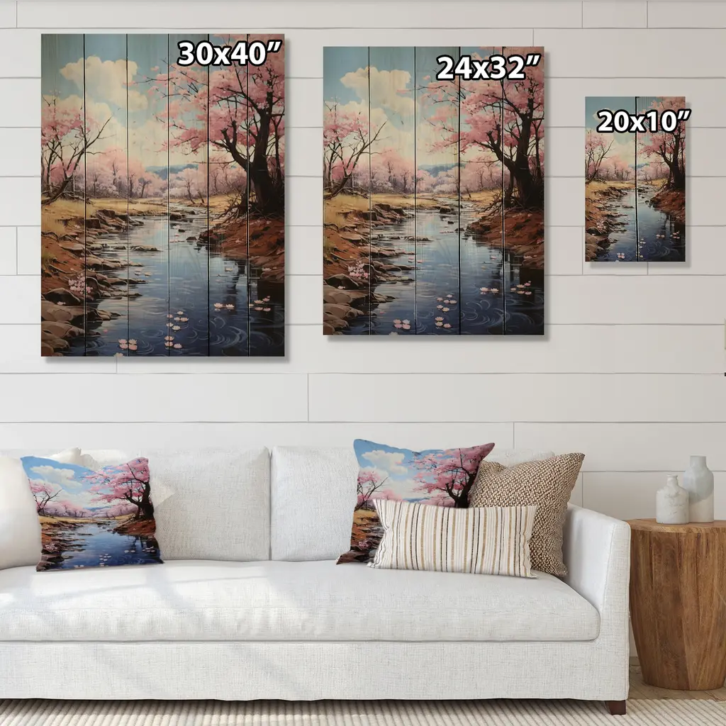 Designart "Japon Art Sakura Dream Pink And Blue Iv" Japanese Print On Natural Pine Wood - 24 In. Wide X 32 In. High