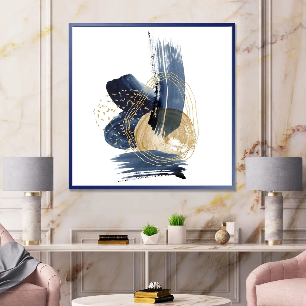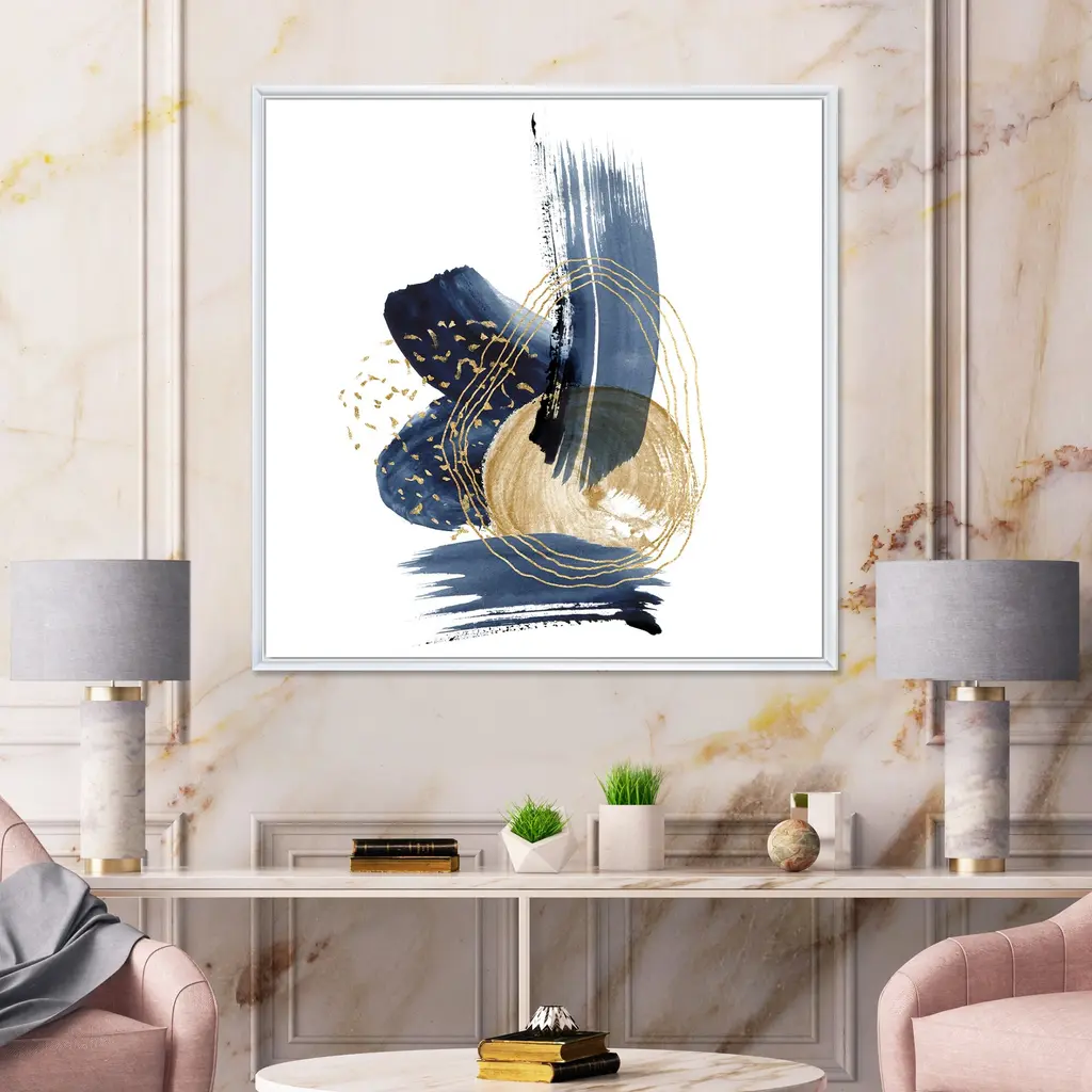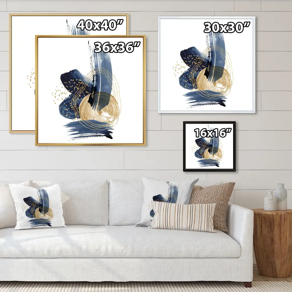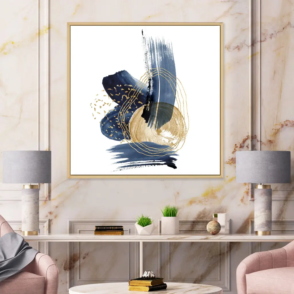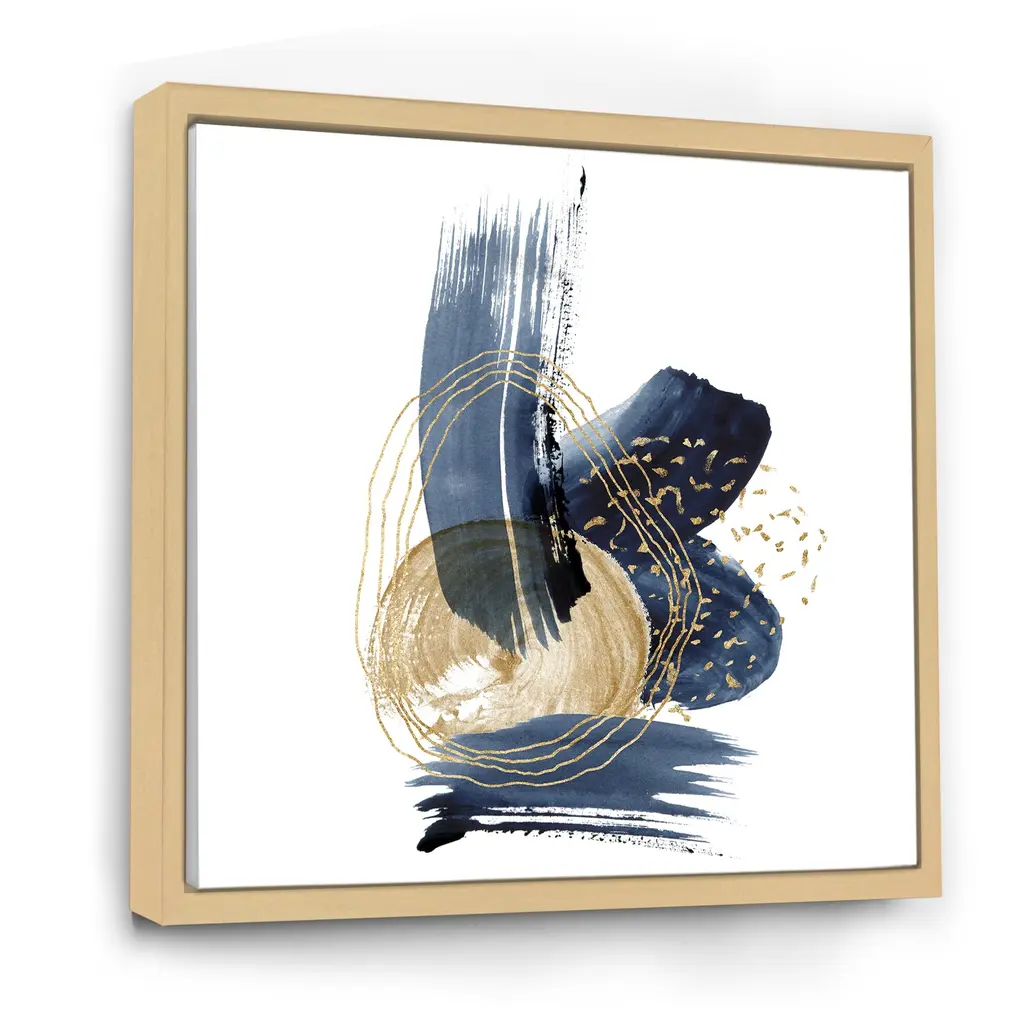 Add a touch of modern elegance to your living space with this Designart 'Landscape of Dark Blue Mountains & Gold Strokes II' Framed Canvas Wall Art Print. The high-quality giclee print features a landscape of dark blue mountains with golden strokes, printed on premium cotton canvas with fade-resistant ink. The print is stretched tightly over a 1-inch wooden sub frame to prevent buckling, and is inserted into a sleek floating frame for a polished look. This framed canvas art arrives ready to hang with all necessary hanging kits included.Features: