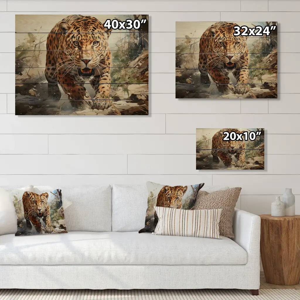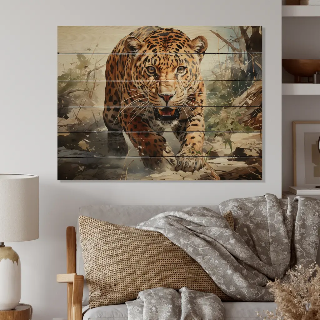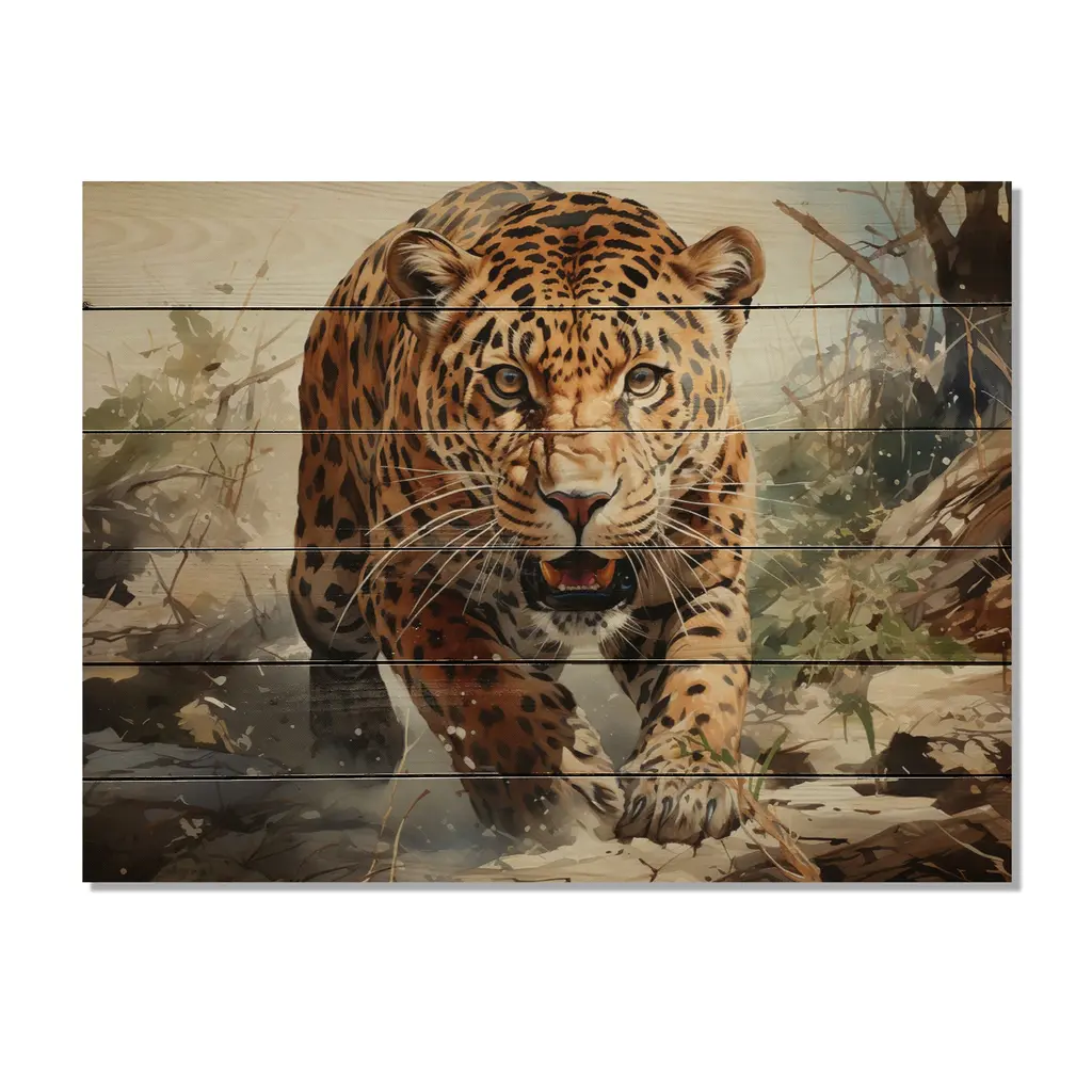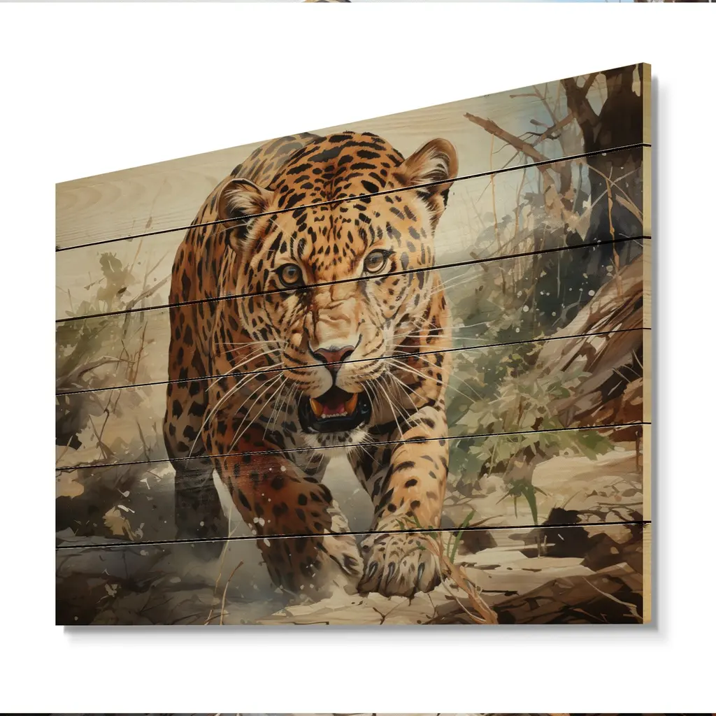 Designart "Leopard Silent Attack" Animals Print On Natural Pine Wood - 32 In. Wide X 24 In. High