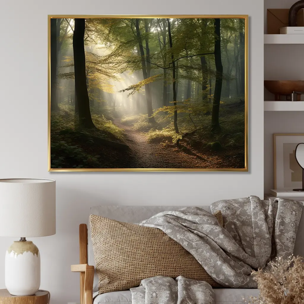 This beautiful Light Streams Through Forest I Framed Canvas Art is printed using the highest quality fade-resistant ink on canvas. Every one of our fine art giclee canvas prints is printed on premium quality canvas, using the finest quality inks which will not fade over time. Each giclee print is stretched tightly over a 1.5-inch wood sub frame ensuring the canvas is taught and does not buckle. The canvas print is inserted into a wood floating frame. All of our Framed canvas prints are carefully packaged with corner protection, fragile labeling and sturdy boxes to ensure safe delivery. Every framed canvas print arrives ready to hang on the wall, with the hanging kits included. This framed art print is available in many different color frames. Features: - Style : Country, - Subject : Landscapes - Color : Green - Premium quality cotton canvas. - Arrives ready to hang on the wall - Easy to Hang