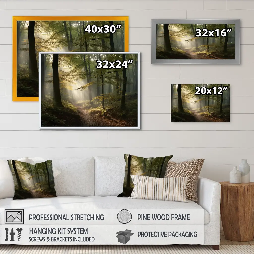 Designart "Light Streams Through Forest I" Landscape Forest Framed Wall Art For Living Room - 32 In. Wide X 16 In. High - Gold