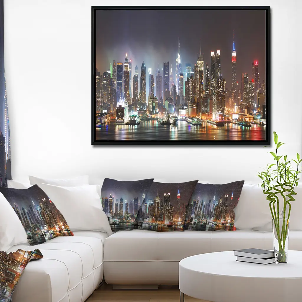 Designart "Lit Nyc Manhattan Skyline" Cityscape Photo Framed Canvas Print - 20 In. Wide X 12 In. High - Black