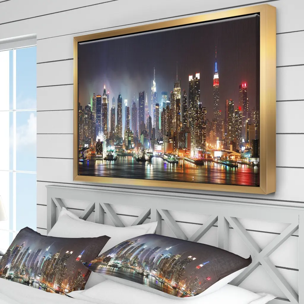 Designart "Lit Nyc Manhattan Skyline" Cityscape Photo Framed Canvas Print - 32 In. Wide X 16 In. High - Gold