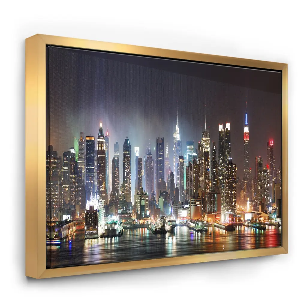 Designart "Lit Nyc Manhattan Skyline" Cityscape Photo Framed Canvas Print - 32 In. Wide X 16 In. High - White