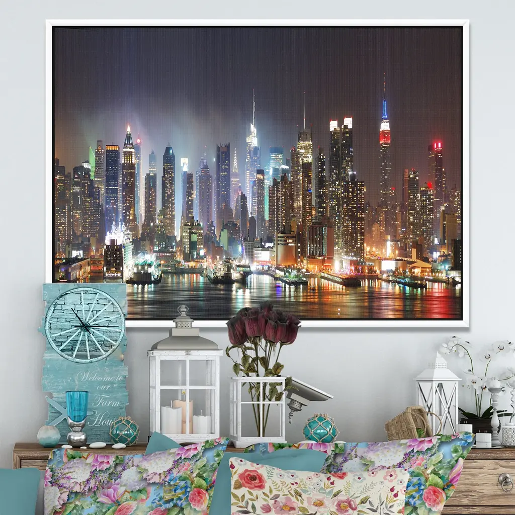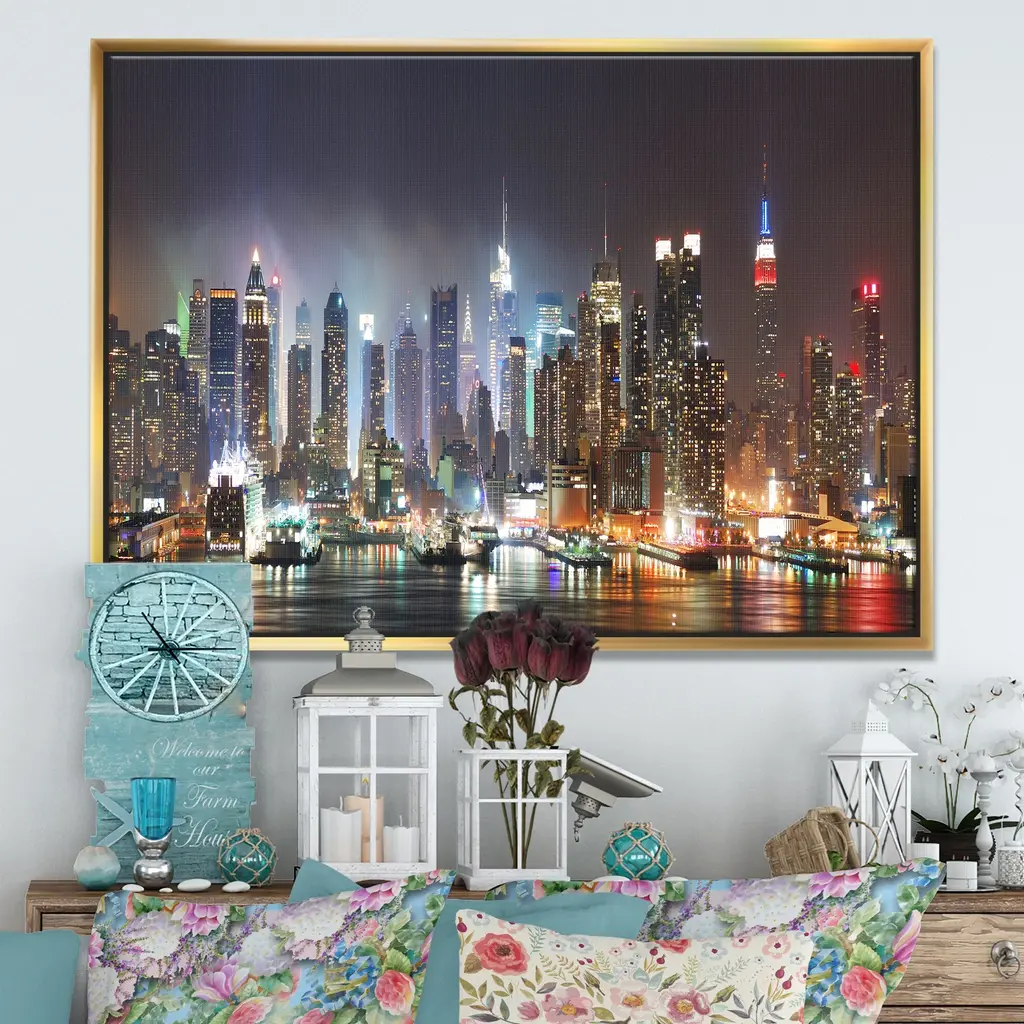 Designart "Lit Nyc Manhattan Skyline" Cityscape Photo Framed Canvas Print - 40 In. Wide X 30 In. High - Black