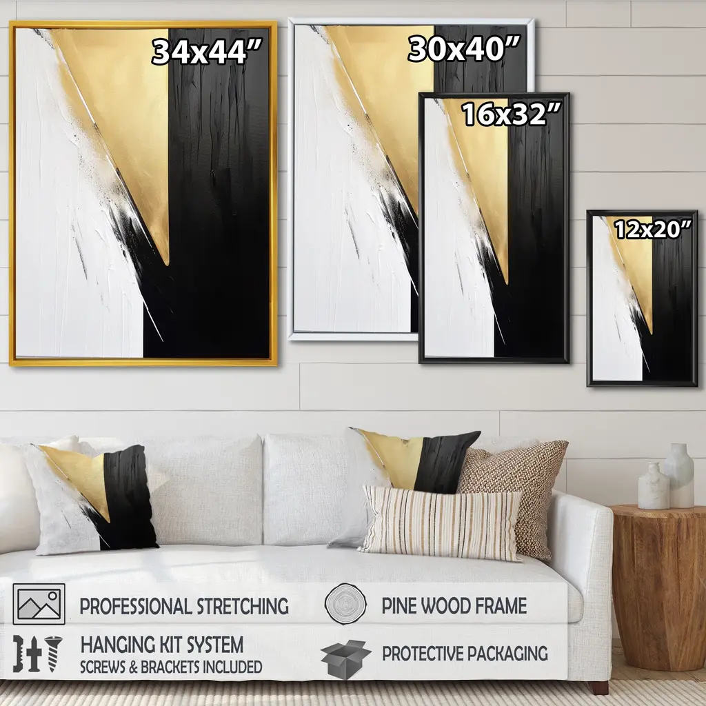 This beautiful Minimal Joy In Black And Gold IV Framed Canvas Art is printed using the highest quality fade-resistant ink on canvas. Every one of our fine art giclee canvas prints is printed on premium quality canvas, using the finest quality inks which will not fade over time. Each giclee print is stretched tightly over a 1-inch wood sub frame ensuring the canvas is taught and does not buckle. The canvas print is inserted into a wood floating frame. All of our Framed canvas prints are carefully packaged with corner protection, fragile labeling and sturdy boxes to ensure safe delivery. Every framed canvas print arrives ready to hang on the wall, with the hanging kits included. This framed art print is available in many different color frames. Features: - Style : Modern & Contemporary - Subject : Abstract - Color : Black, White - Premium quality cotton canvas. - Arrives ready to hang on the wall - Easy to Hang