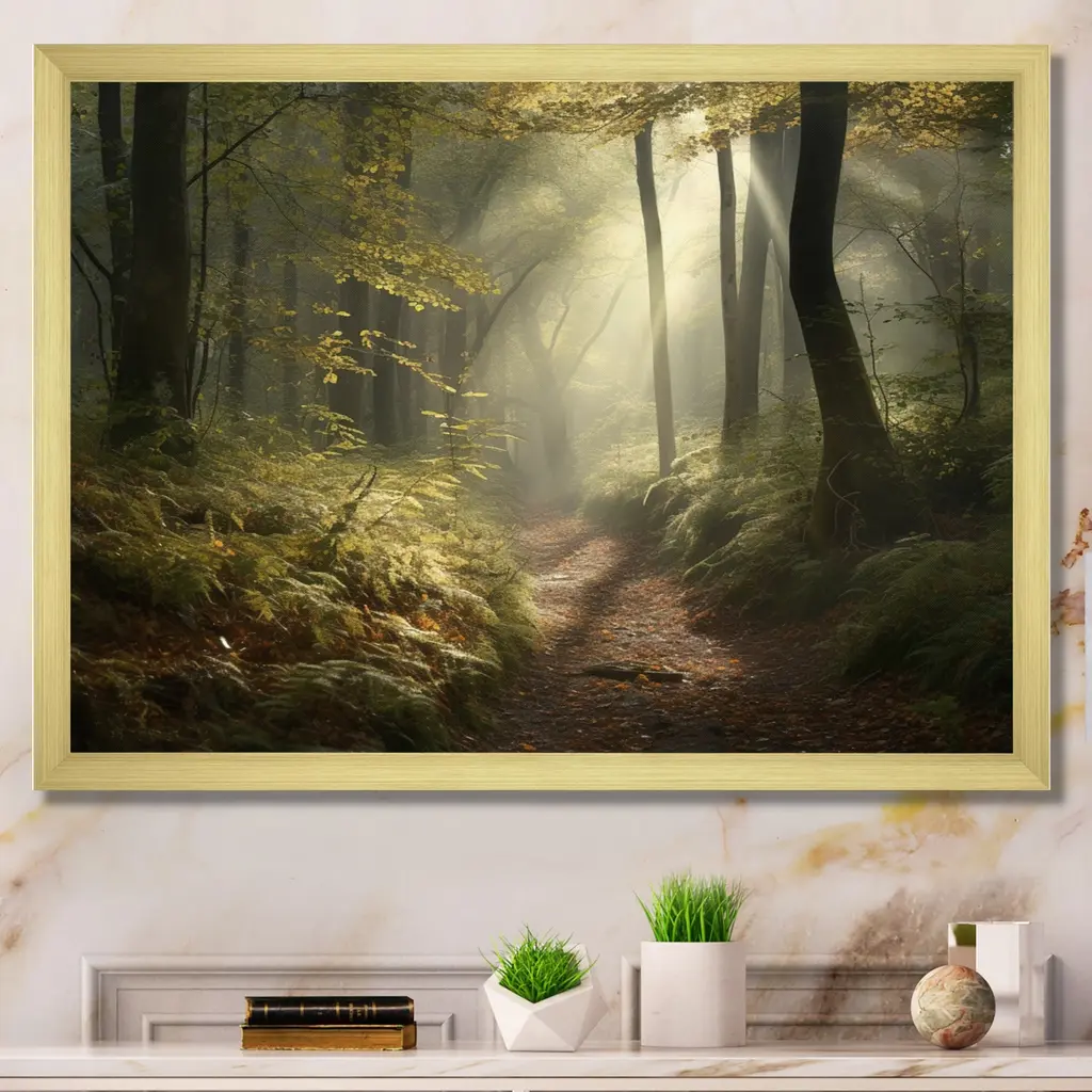 Designart "Misty Trail In The Woods I" Landscape Forest Framed Canvas Art Print - 44 In. Wide X 34 In. High - Gold