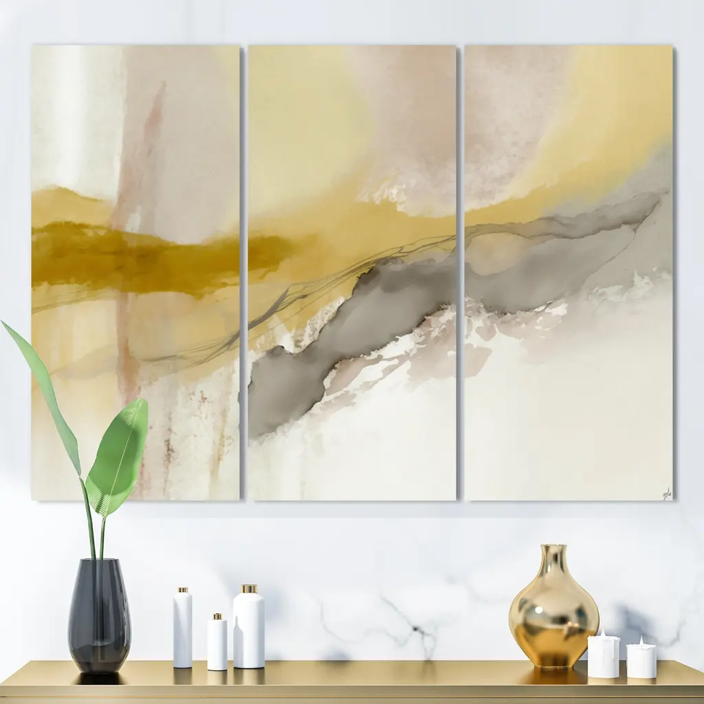 Designart "Mustard Yellow Secrets V" Abstract Liquid Ink Canvas Wall Art Print - 48 In. Wide X 32 In. High - 3 Panels
