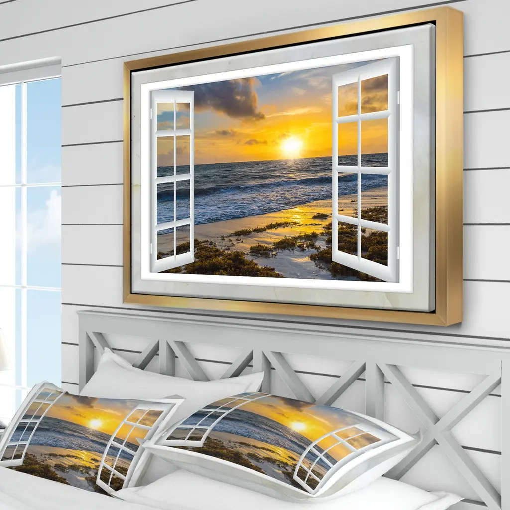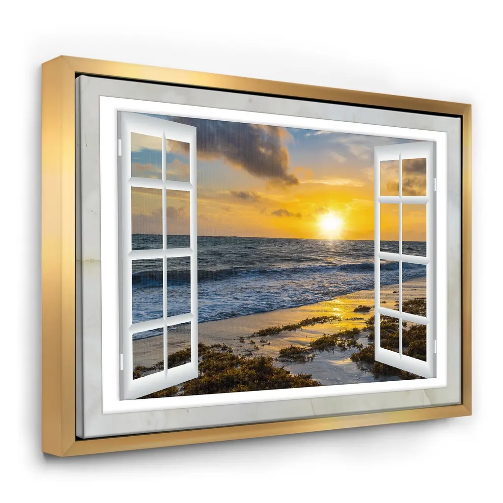Designart "Open Window To Bright Yellow Sunset" Modern Seascape Framed Canvas Artwork Print - 40 In. Wide X 30 In. High - White