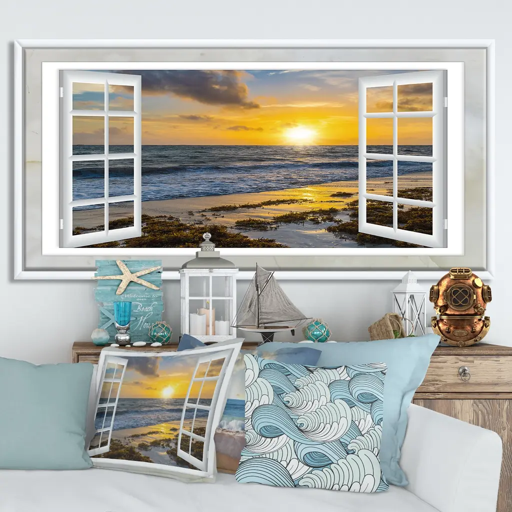 Designart "Open Window To Bright Yellow Sunset" Modern Seascape Framed Canvas Artwork Print - 44 In. Wide X 34 In. High - Gold