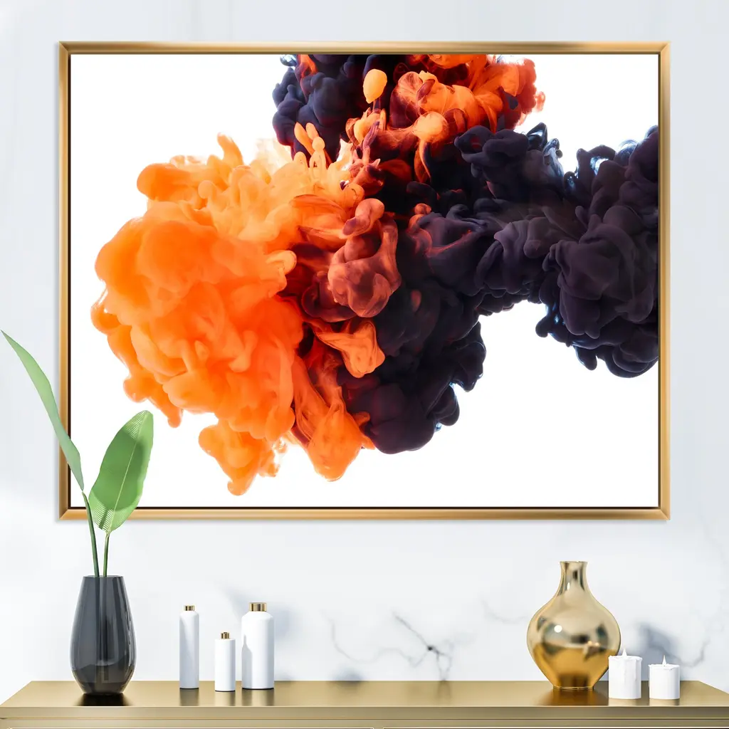 This beautiful Orange And Black Dancing Ink Clouds Framed Canvas Art is printed using the highest quality fade-resistant ink on canvas. Every one of our fine art giclee canvas prints is printed on premium quality canvas, using the finest quality inks which will not fade over time. Each giclee print is stretched tightly over a 1-inch wood sub frame ensuring the canvas is taught and does not buckle. The canvas print is inserted into a wood floating frame. All of our Framed canvas prints are carefully packaged with corner protection, fragile labeling and sturdy boxes to ensure safe delivery. Every framed canvas print arrives ready to hang on the wall, with the hanging kits included. This framed art print is available in many different color frames. Features: - Style : Modern & Contemporary - Subject : Abstract, - Color : Orange - Premium quality cotton canvas. - Arrives ready to hang on the wall - Easy to Hang