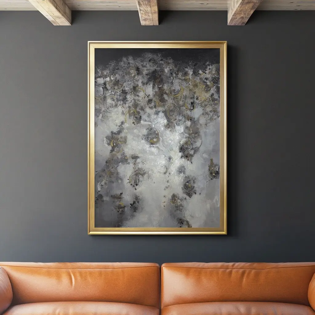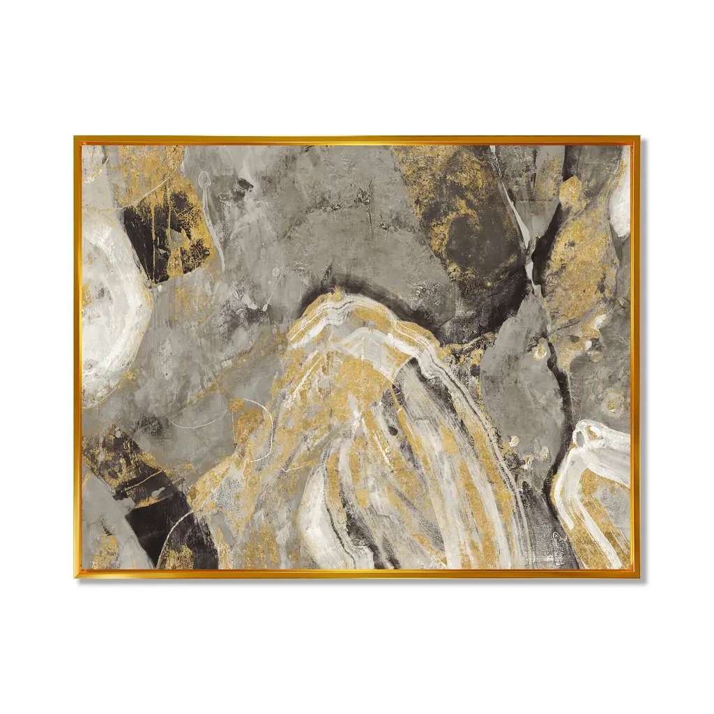 Add a touch of modern rustic charm to your home with this Designart 'Painted Gold Stone' Cabin & Lodge Framed Canvas in Grey. This stunning artwork showcases abstract patterns that are sure to catch the eye of anyone who enters your living room. The print is made on high-quality canvas that preserves the colors, ensuring long-lasting vibrancy. The framed canvas boasts a polished look, adding an elegant touch to your decor. Installation is a breeze as it arrives ready to hang.Features: