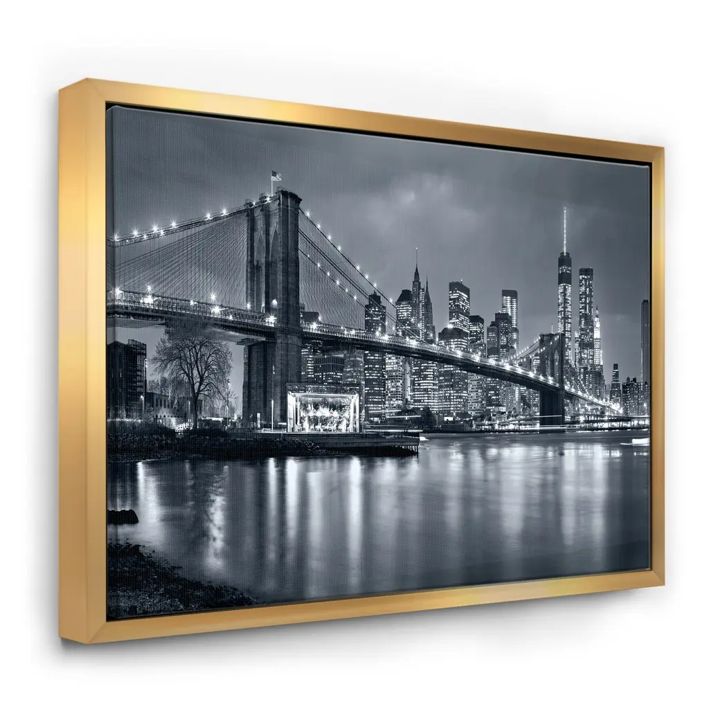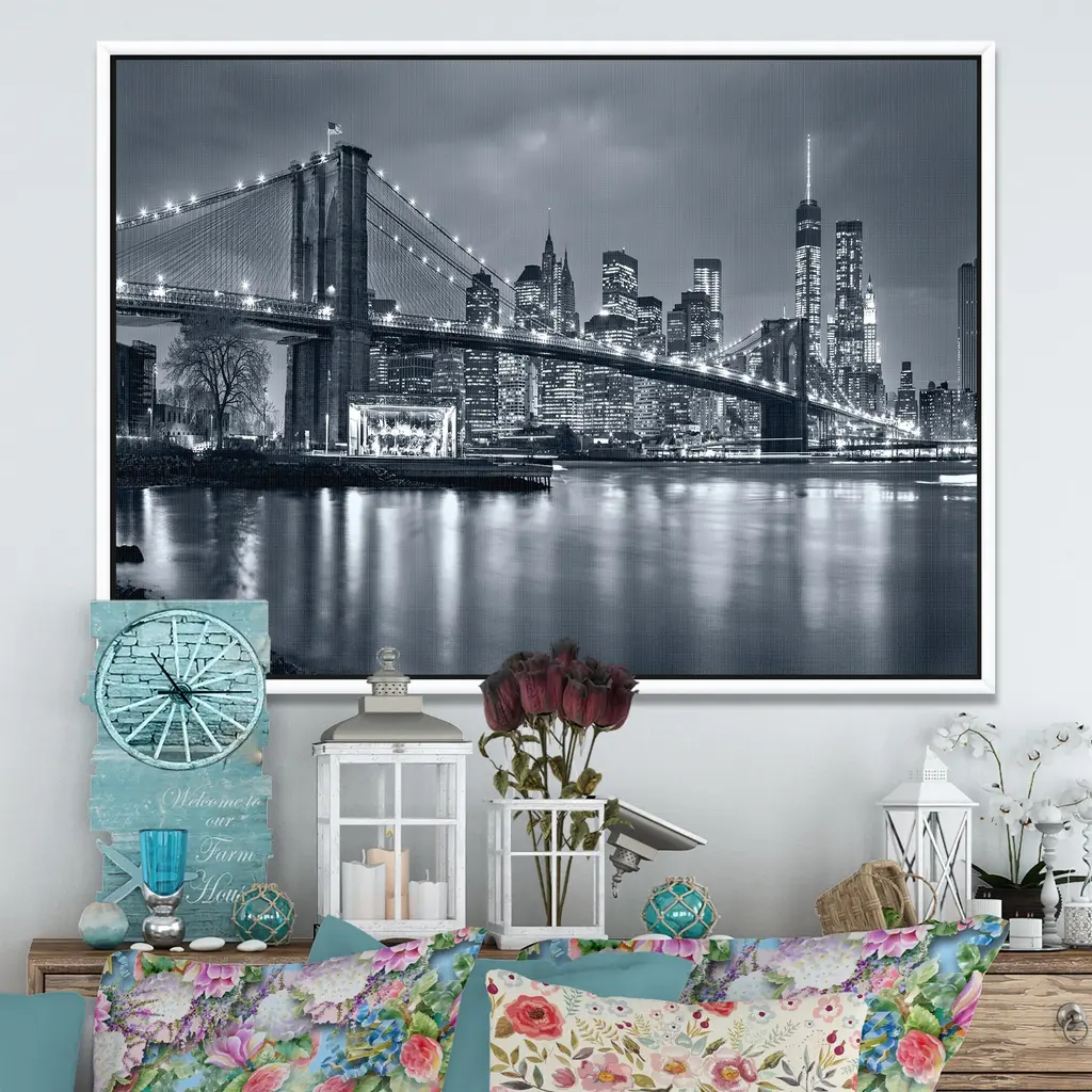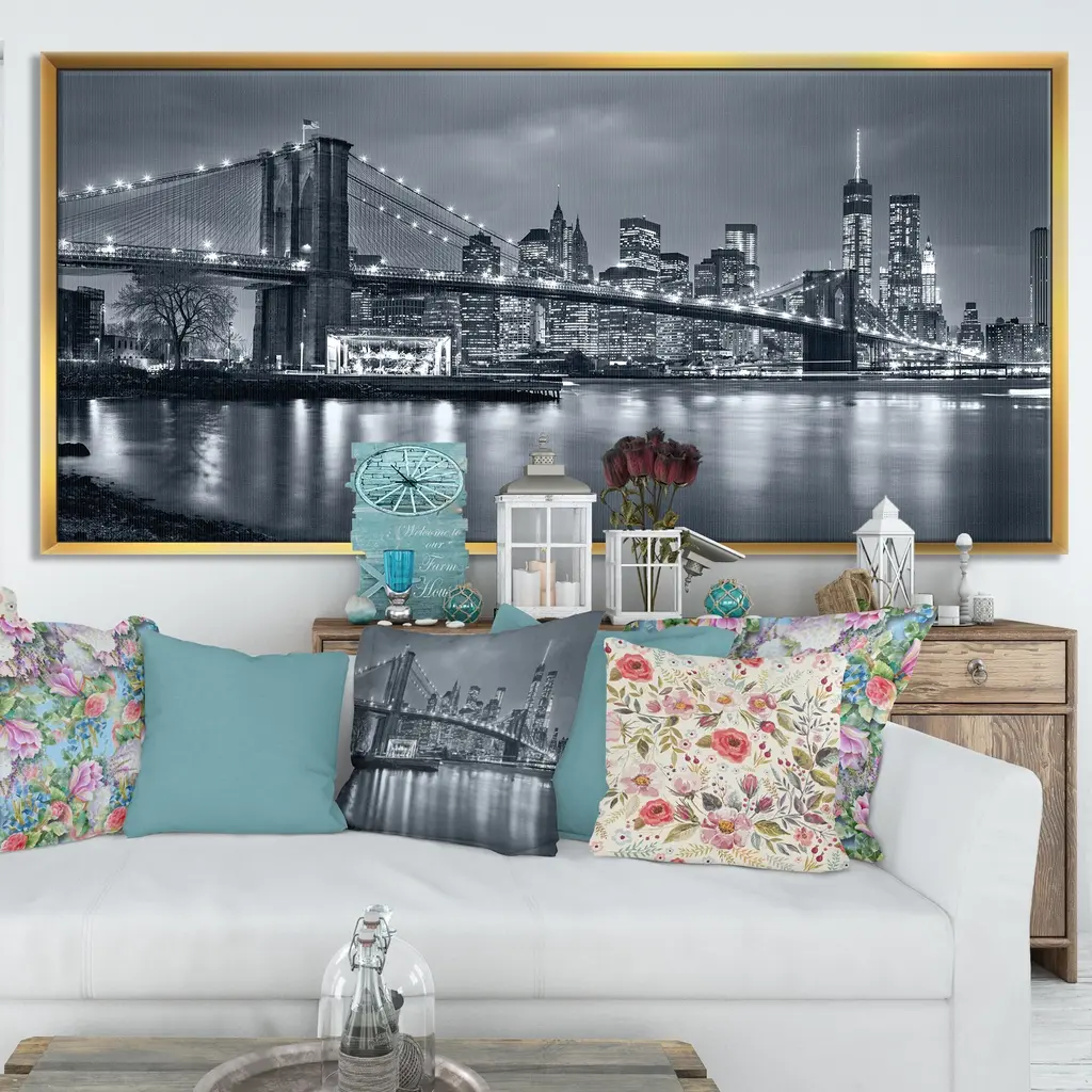 Designart "Panorama New York City At Night" Cityscape Framed Canvas Print - 32 In. Wide X 16 In. High - Black