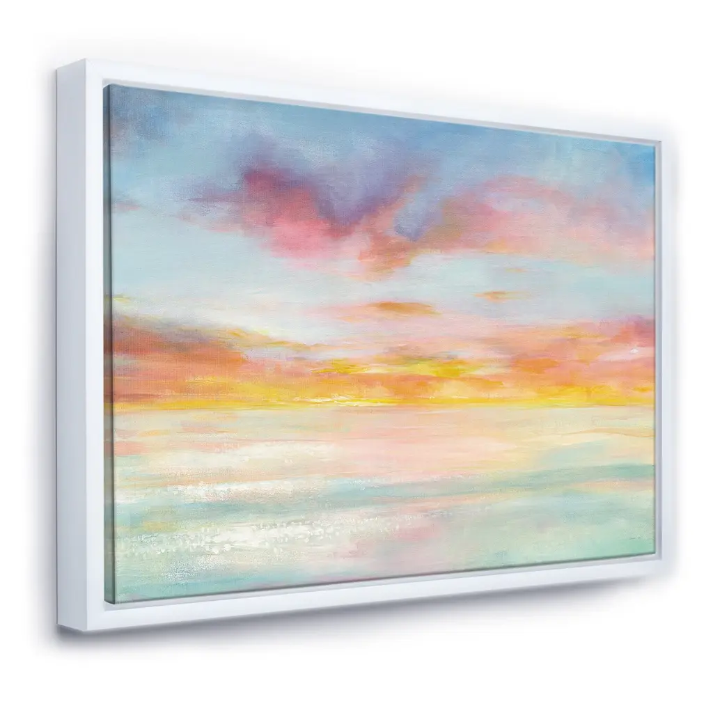 This beautiful Pastel Pink And Blue Clouds Framed Canvas Art is printed using the highest quality fade-resistant ink on canvas. Every one of our fine art giclee canvas prints is printed on premium quality canvas, using the finest quality inks which will not fade over time. Each giclee print is stretched tightly over a 1-inch wood sub frame ensuring the canvas is taught and does not buckle. The canvas print is inserted into a wood floating frame. All of our Framed canvas prints are carefully packaged with corner protection, fragile labeling and sturdy boxes to ensure safe delivery. Every framed canvas print arrives ready to hang on the wall, with the hanging kits included. Features: - Style : Nautical & Coastal, Traditional - Subject : Abstract - Color : Blue, Orange - Premium quality cotton canvas. - Arrives ready to hang on the wall - Easy to Hang