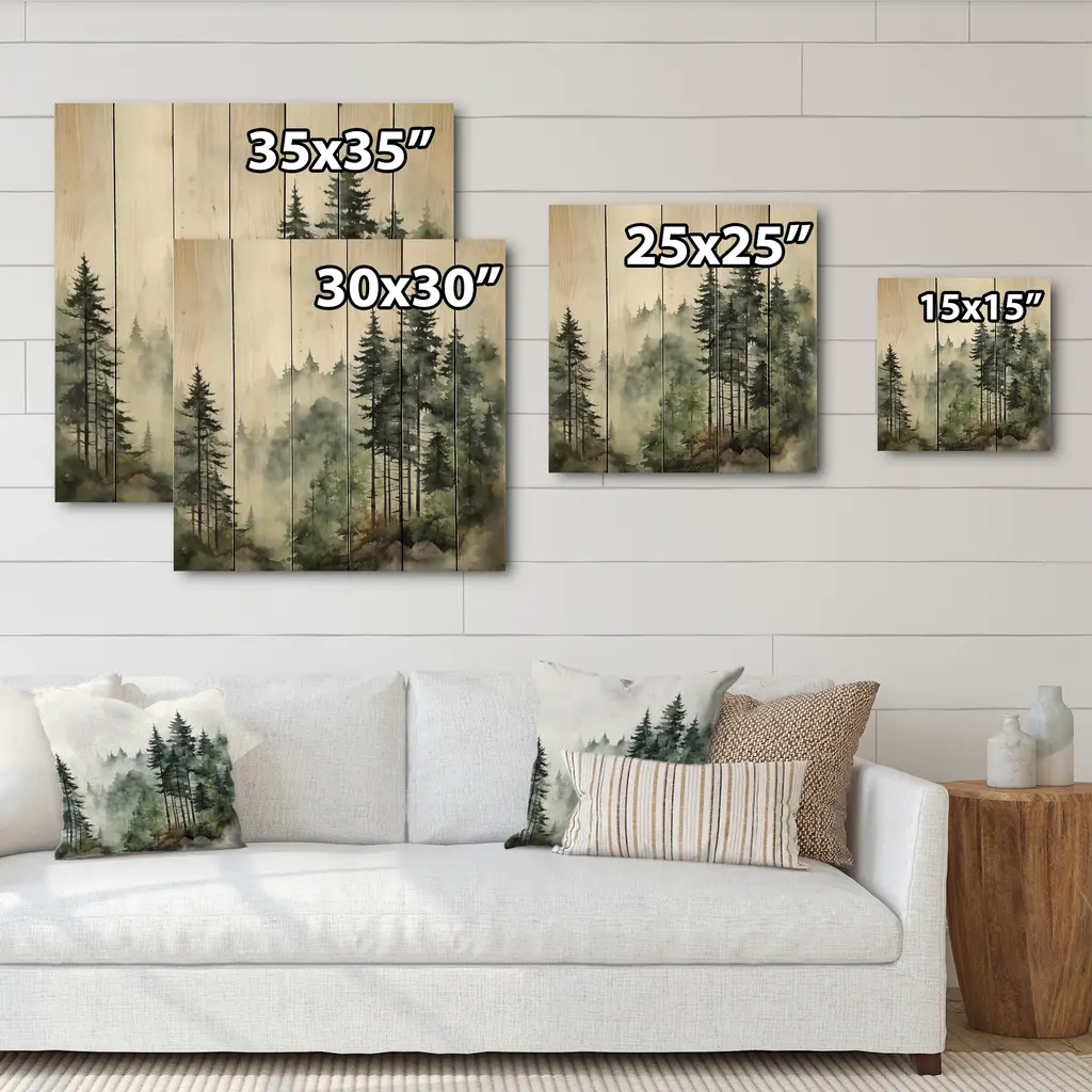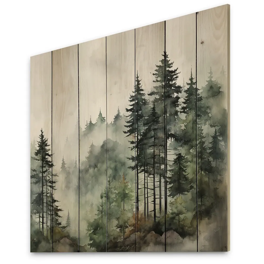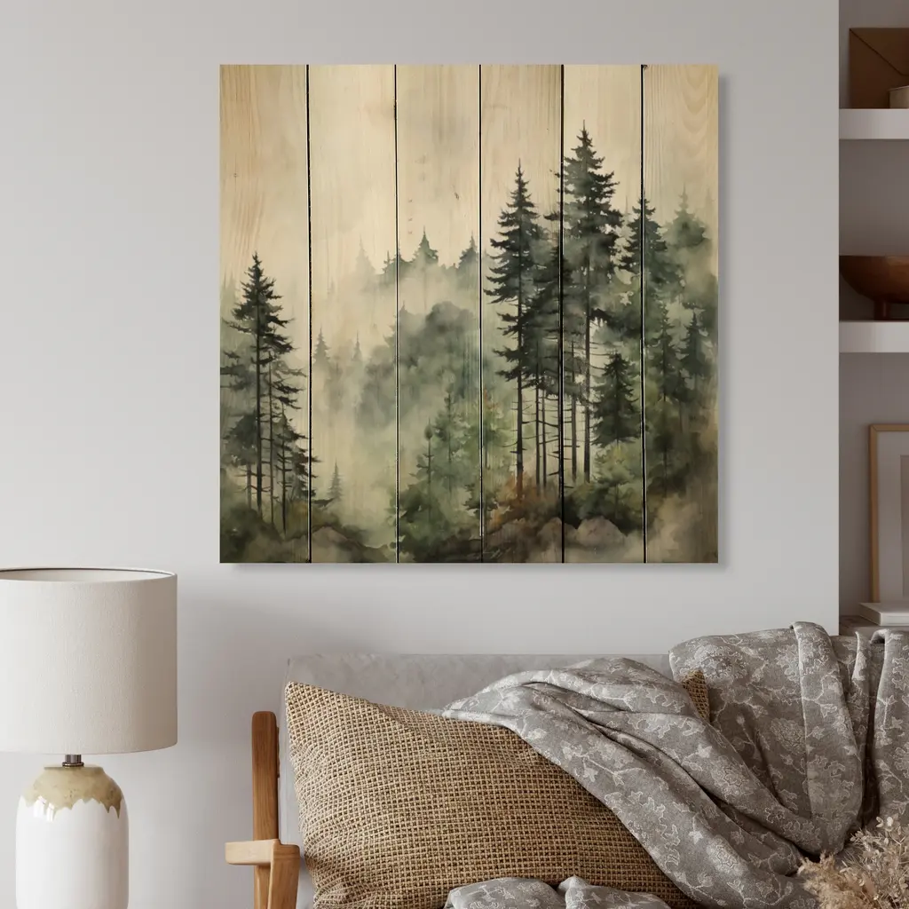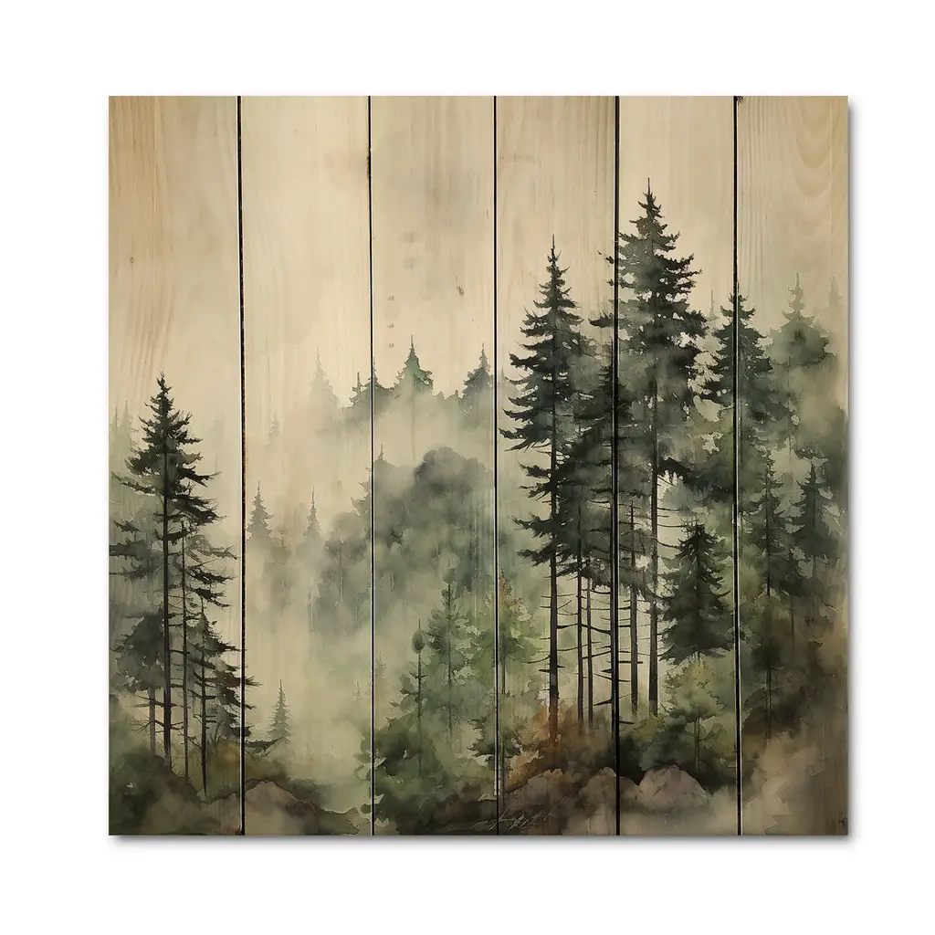 Designart "Pine Tree Misty Morning I" Landscapes Print On Natural Pine Wood - 25 In. Wide X 25 In. High