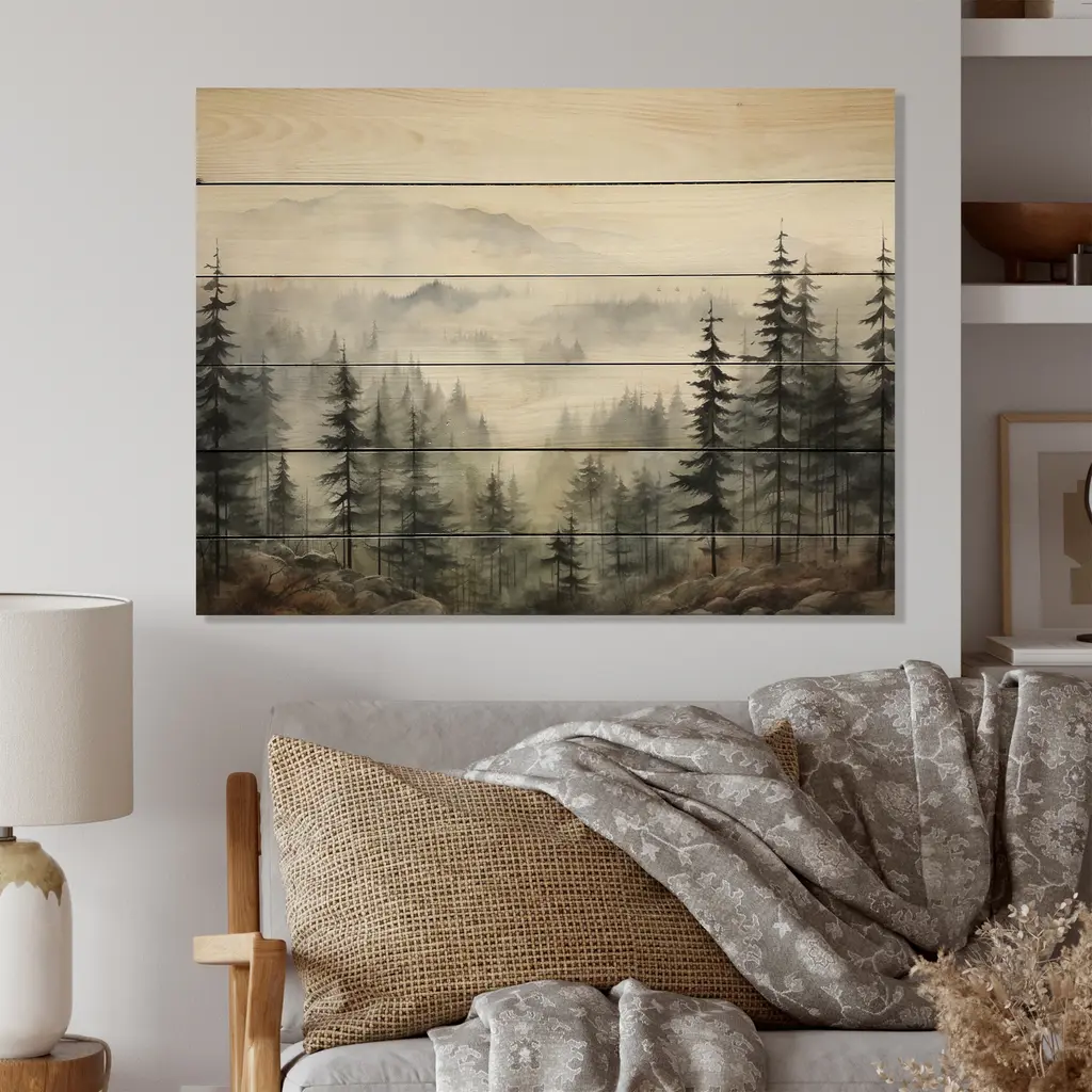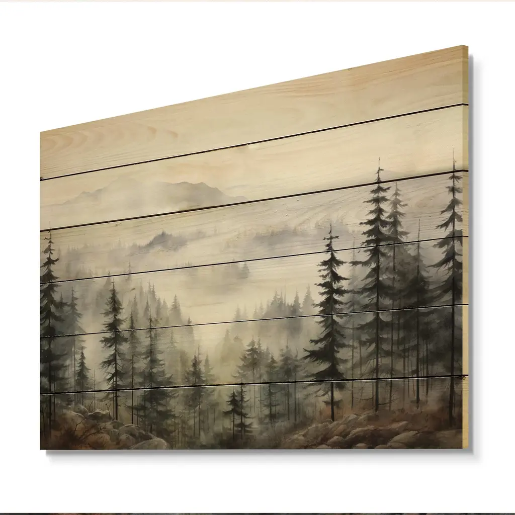 Designart "Pine Tree Misty Mountain Ii" Floral Print On Natural Pine Wood - 40 In. Wide X 30 In. High