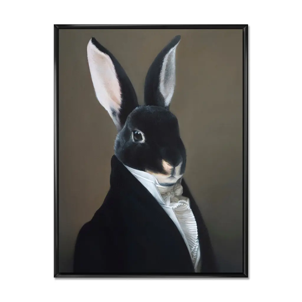 This beautiful Portrait Of A Dressed Up Rabbit Framed Canvas Art is printed using the highest quality fade-resistant ink on canvas. Every one of our fine art giclee canvas prints is printed on premium quality canvas, using the finest quality inks which will not fade over time. Each giclee print is stretched tightly over a 1-inch wood sub frame ensuring the canvas is taught and does not buckle. The canvas print is inserted into a wood floating frame. All of our Framed canvas prints are carefully packaged with corner protection, fragile labeling and sturdy boxes to ensure safe delivery. Every framed canvas print arrives ready to hang on the wall, with the hanging kits included. This framed art print is available in many different color frames. Features: - Style : Children's Art - Subject : Animals, Circus - Color : Black - Premium quality cotton canvas. - Arrives ready to hang on the wall - Easy to Hang