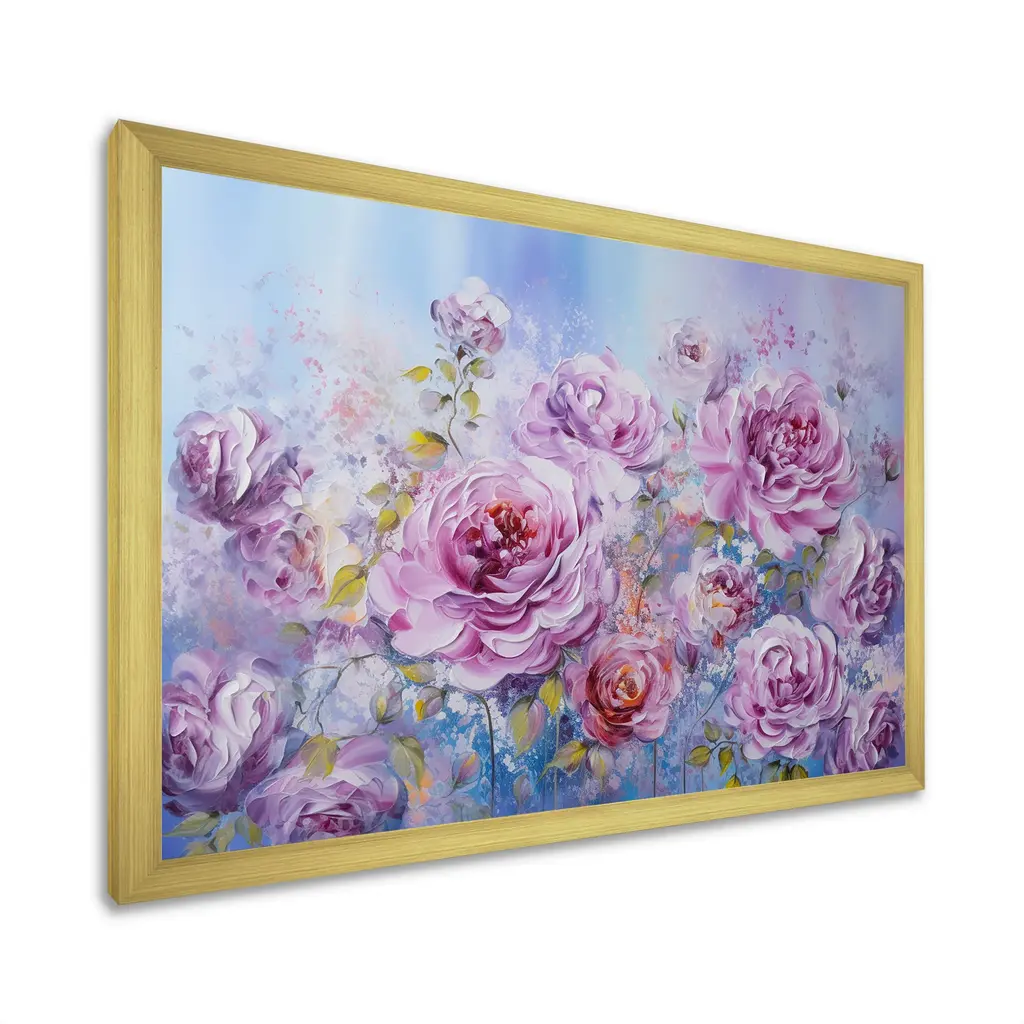 This beautiful "Purple Roses Florescence" Framed wall Art is printed using the highest quality fade resistant ink on canvas. Every one of our Floral Framed Wall art printed on premium quality cotton canvas, Each Traditional Framed Canvas print is stretched tightly over a 1-inch wood sub frame and inserted into a 1.5 Frame. All of our Framed Canvas Prints are carefully packaged with corner protection, fragile labeling and sturdy boxes to ensure safe delivery. Every framed canvas print arrives ready to hang on the wall, with the hanging kits included. This framed art print is available in many different color frames. Features: - Style : Traditional Framed Canvas - Subject : Flower Field Wall Art - Color : Pink - Premium quality cotton canvas. - Arrives ready to hang on the wall. - Frame Tickness : 1 inch - Frame Width : 1.5 inch Wide - Easy to Hang