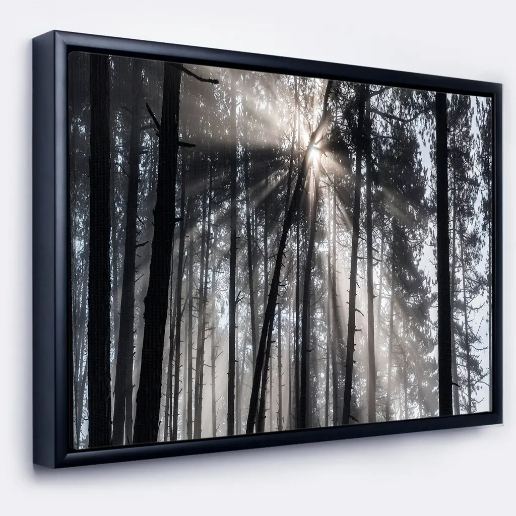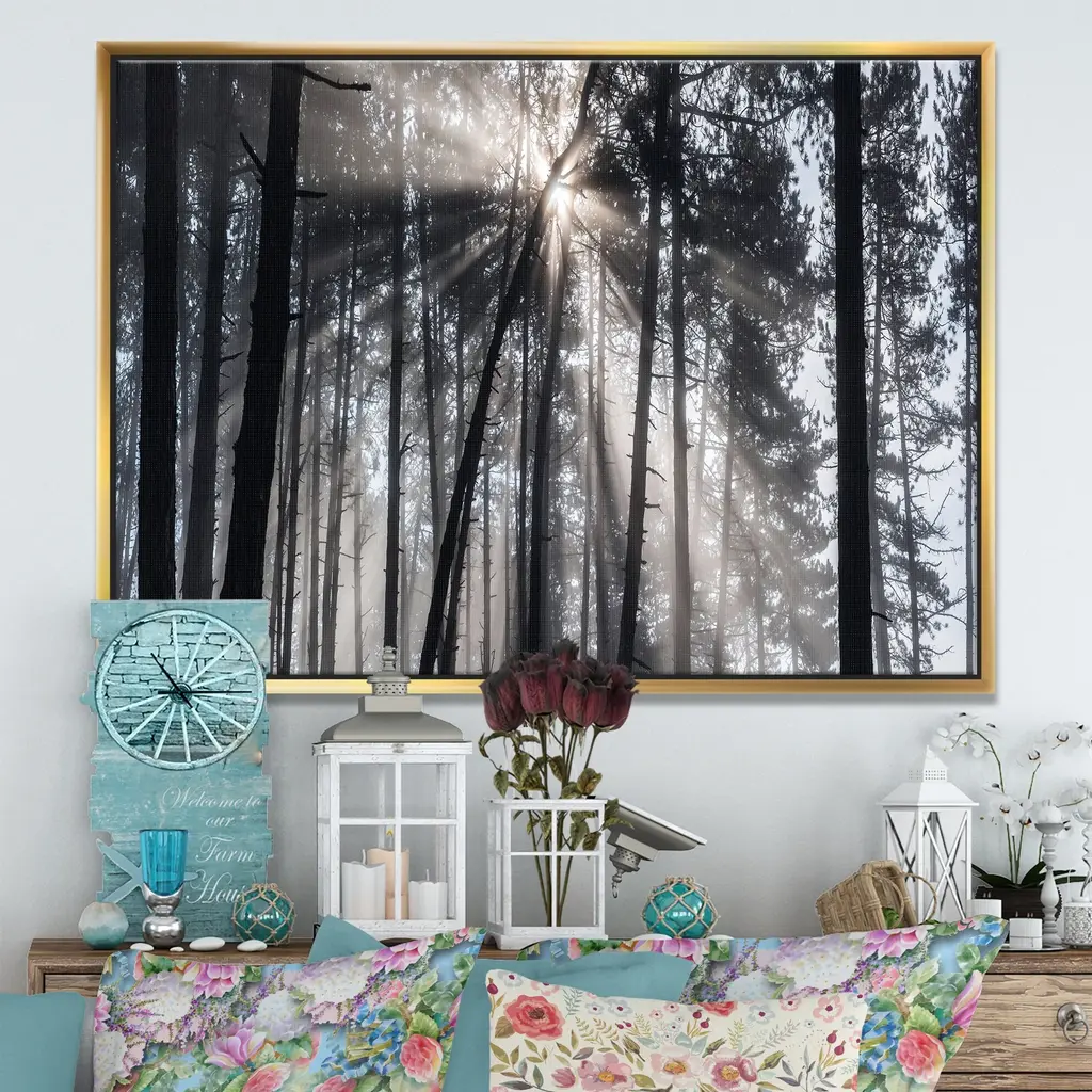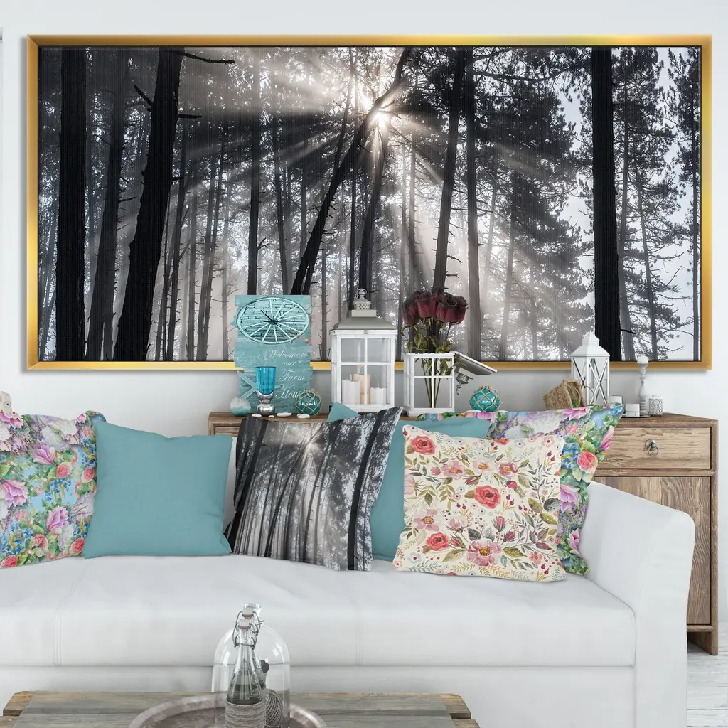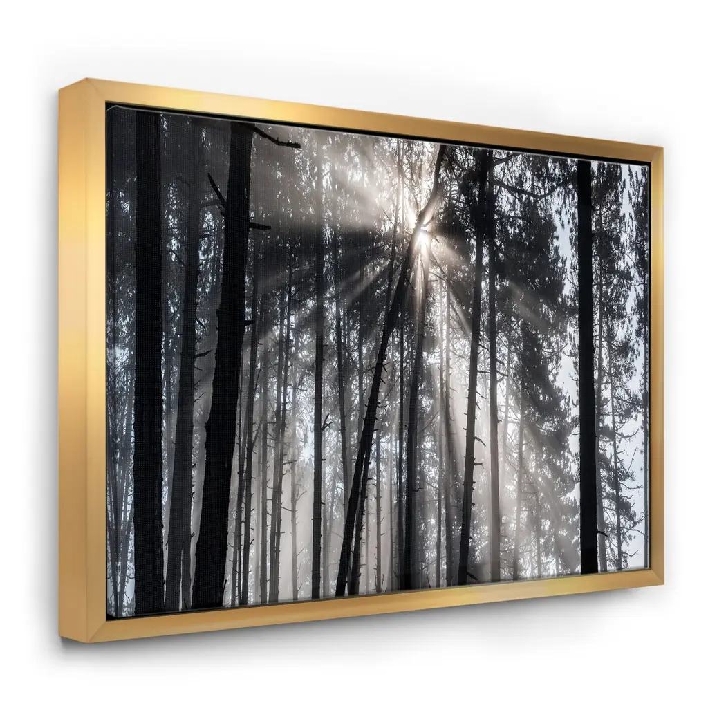 Designart "Sunbeams Through Black White Forest" Forest Framed Canvas Wall Art Print - 40 In. Wide X 30 In. High - Gold
