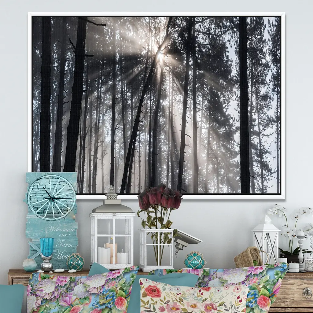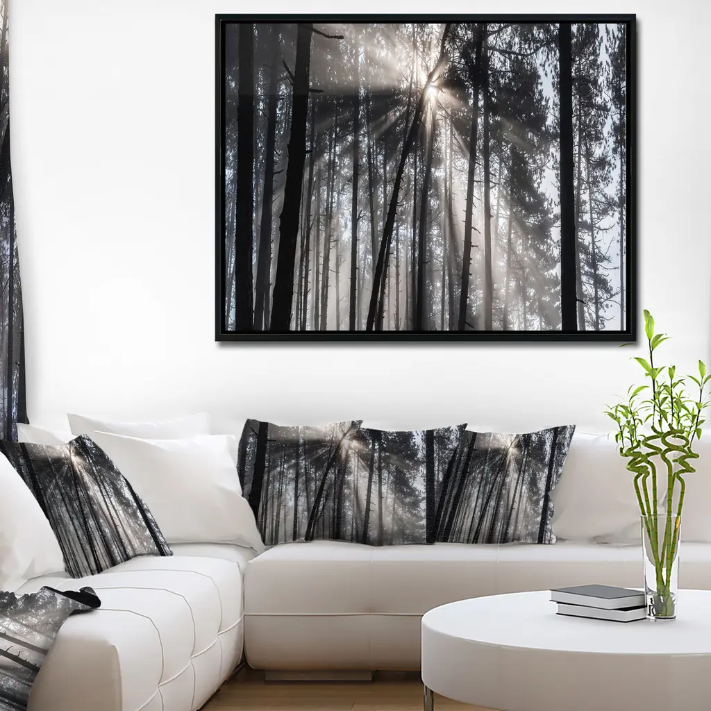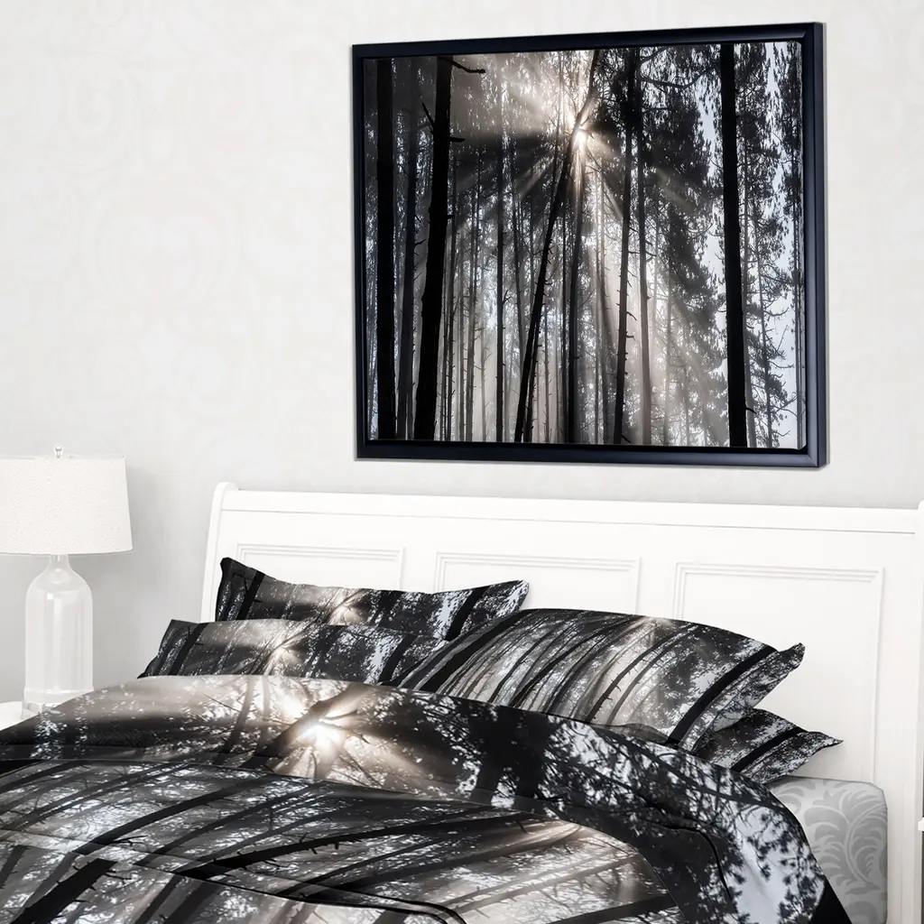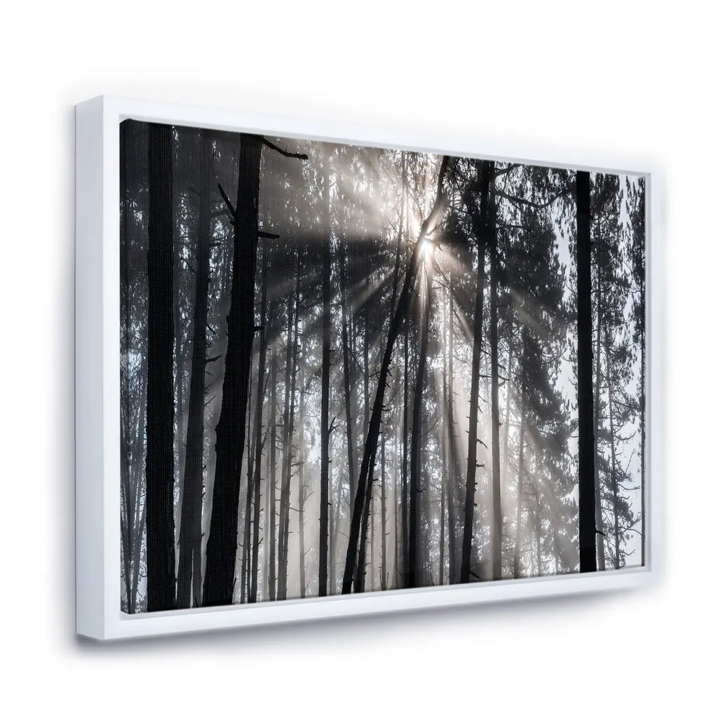 Designart "Sunbeams Through Black White Forest" Forest Framed Canvas Wall Art Print - 40 In. Wide X 30 In. High - Gold
