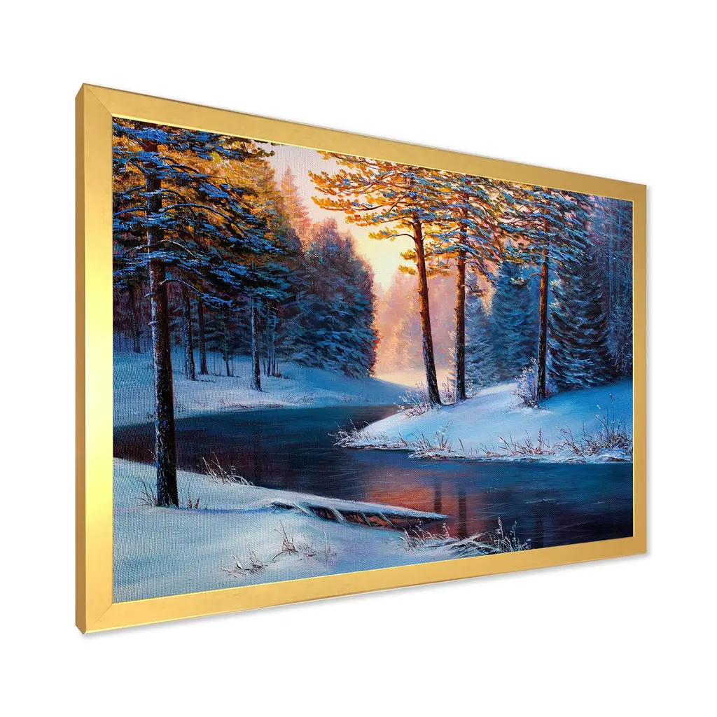 Designart "Sunshine Through The Christmas Forest By The River" Lake House Framed Art Print - 20 In. Wide X 12 In. High - Gold