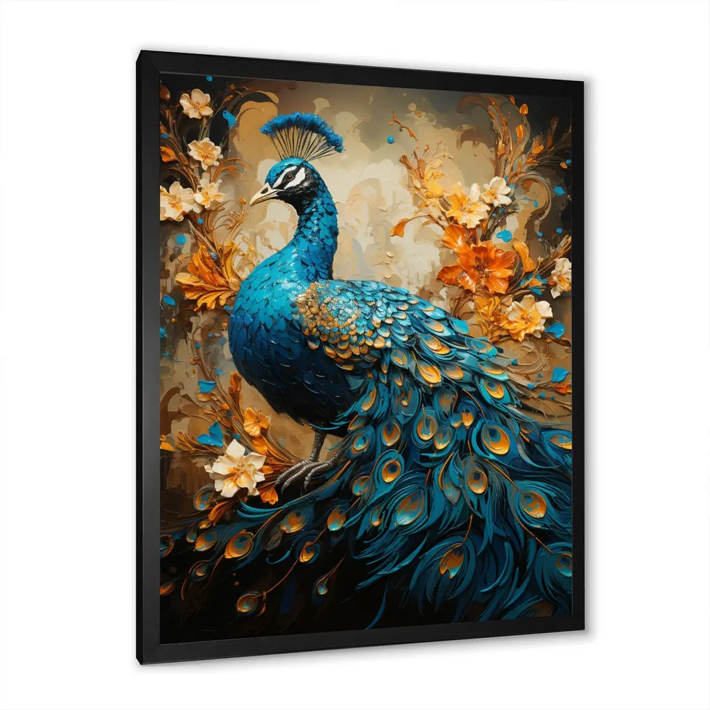 Designart "Teal Gold Emerald Peacock Drips" Animals Peacock Framed Canvas Art Print - 16 In. Wide X 32 In. High - Black