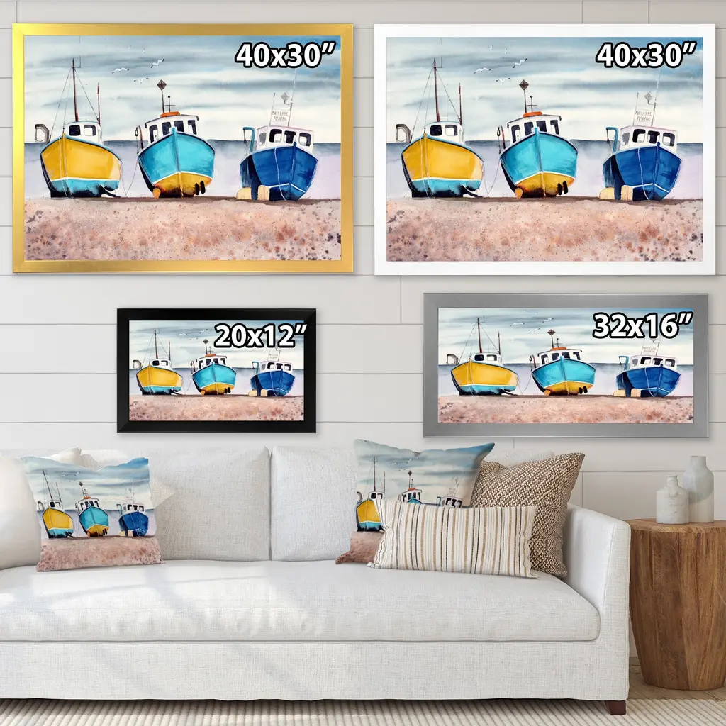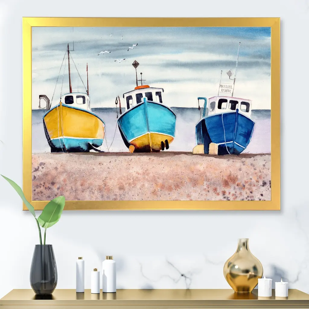 Designart "Three Colorful Fishing Boats On A Sandy Seashore" Nautical & Coastal Framed Art Print - 20 In. Wide X 12 In. High - Gold