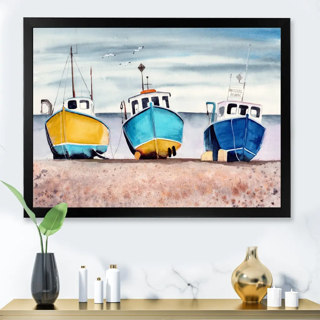 This beautiful Three Colorful Fishing Boats On A Sandy Seashore Framed wall Art is printed using the highest quality fade resistant ink on canvas. Every one of our Framed Giclee Prints is printed on premium quality canvas, using the finest quality inks which will not fade over time and then mounted and framed on a 1.5 inch wide frame. This framed art print is available in many different color frames. All of our framed art prints are carefully packaged with corner protectors, fragile labeling, and sturdy boxes to ensure a safe delivery. Every framed art arrives ready to hang on the wall, with the hanging kit included. Features: - Style : Nautical & Coastal - Subject : Transportation - Color : Blue - Premium quality cotton canvas mounted. - Available in several frame colors. - Arrives with instructions and hanging kit