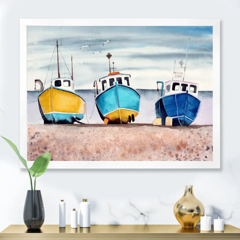 Designart "Three Colorful Fishing Boats On A Sandy Seashore" Nautical & Coastal Framed Art Print - 20 In. Wide X 12 In. High - White