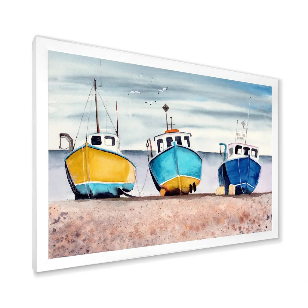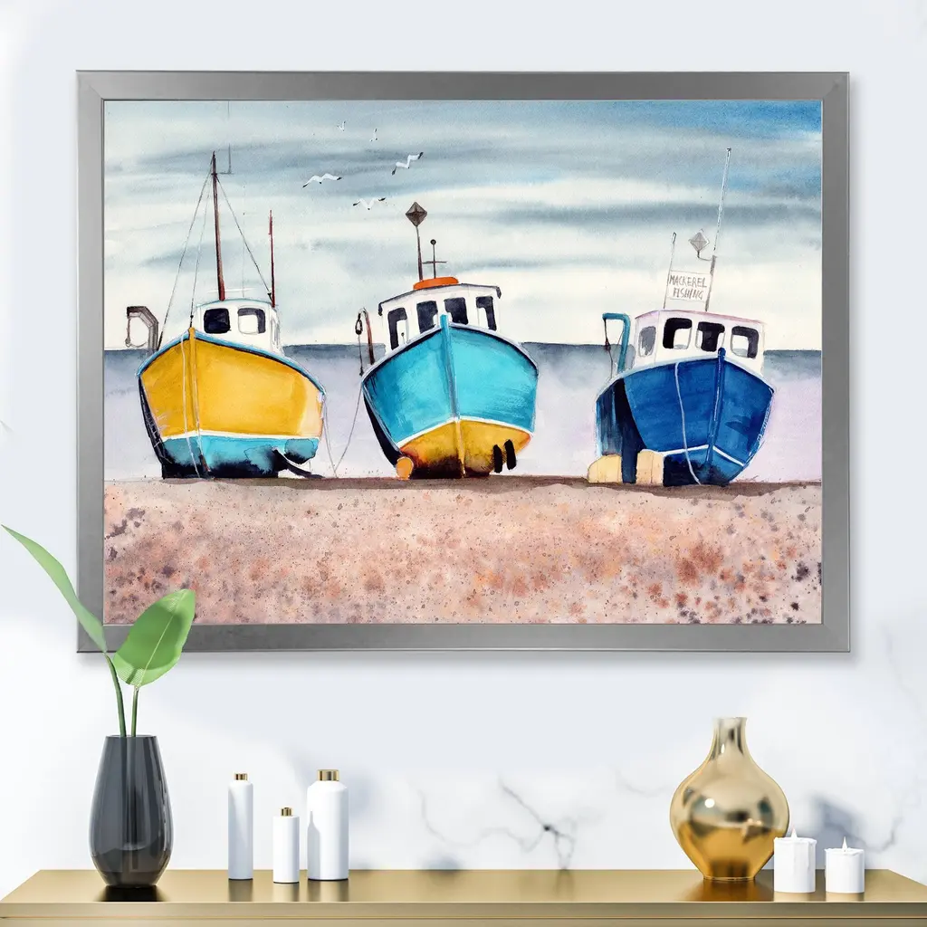 This beautiful Three Colorful Fishing Boats On A Sandy Seashore Framed wall Art is printed using the highest quality fade resistant ink on canvas. Every one of our Framed Giclee Prints is printed on premium quality canvas, using the finest quality inks which will not fade over time and then mounted and framed on a 1.5 inch wide frame. This framed art print is available in many different color frames. All of our framed art prints are carefully packaged with corner protectors, fragile labeling, and sturdy boxes to ensure a safe delivery. Every framed art arrives ready to hang on the wall, with the hanging kit included. Features: - Style : Nautical & Coastal - Subject : Transportation - Color : Blue - Premium quality cotton canvas mounted. - Available in several frame colors. - Arrives with instructions and hanging kit