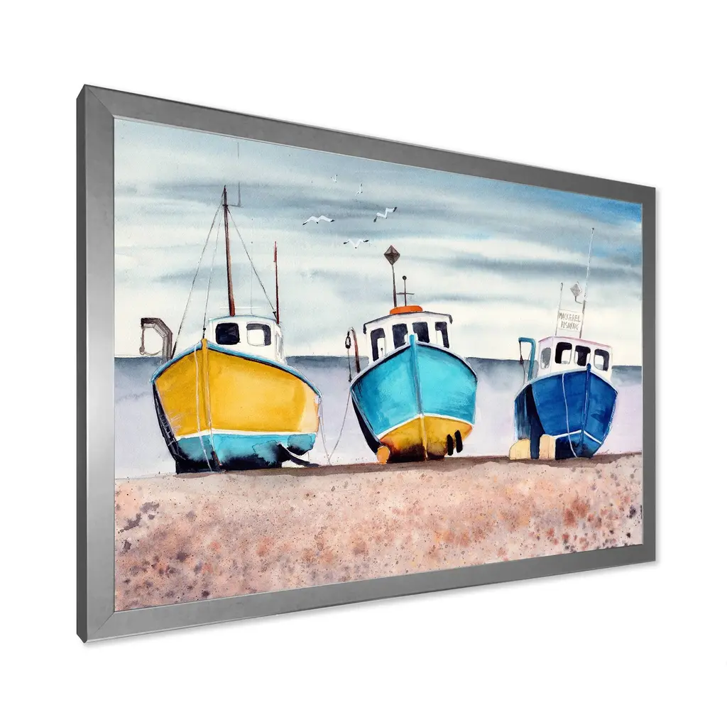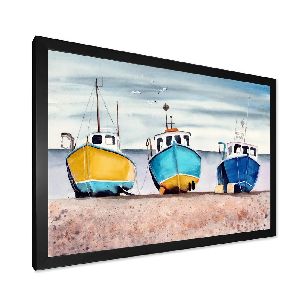 This beautiful Three Colorful Fishing Boats On A Sandy Seashore Framed wall Art is printed using the highest quality fade resistant ink on canvas. Every one of our Framed Giclee Prints is printed on premium quality canvas, using the finest quality inks which will not fade over time and then mounted and framed on a 1.5 inch wide frame. This framed art print is available in many different color frames. All of our framed art prints are carefully packaged with corner protectors, fragile labeling, and sturdy boxes to ensure a safe delivery. Every framed art arrives ready to hang on the wall, with the hanging kit included. Features: - Style : Nautical & Coastal - Subject : Transportation - Color : Blue - Premium quality cotton canvas mounted. - Available in several frame colors. - Arrives with instructions and hanging kit