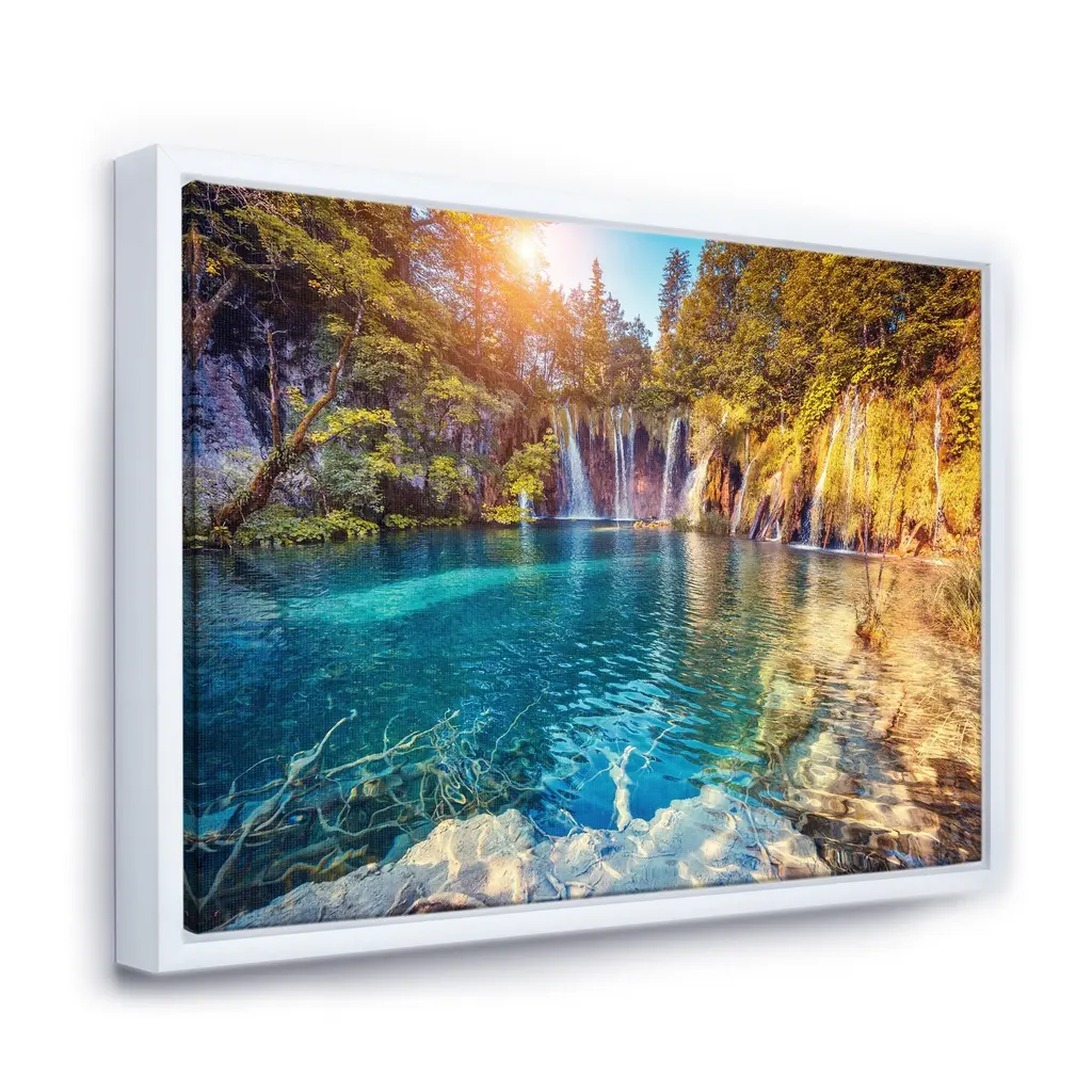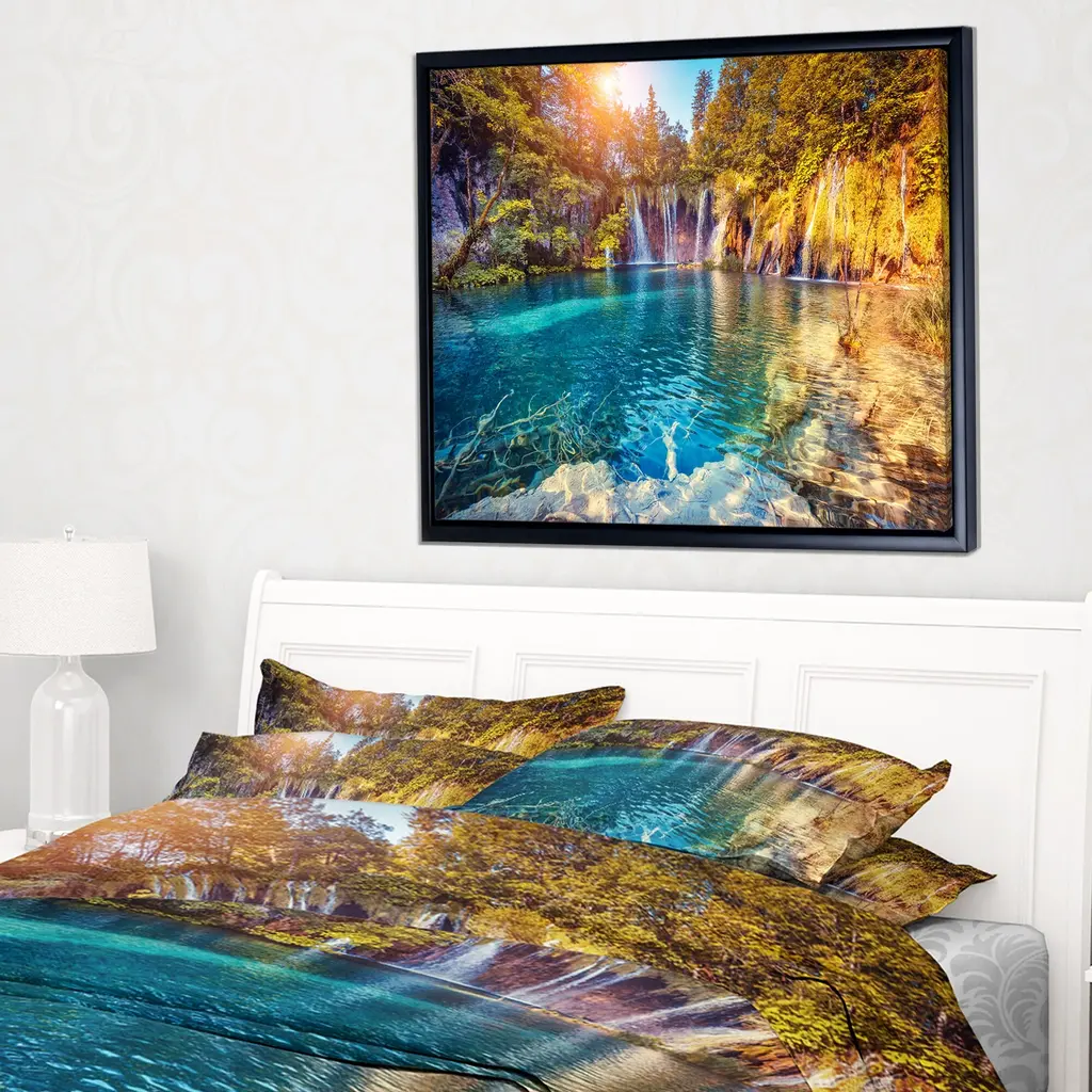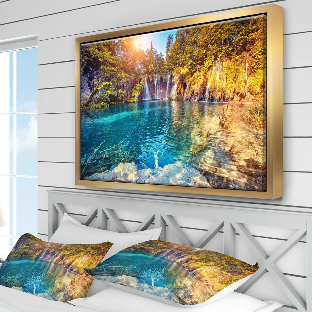 Designart "Turquoise Water And Sunny Beams" Landscape Photography Framed Canvas Print - 32 In. Wide X 16 In. High - Black