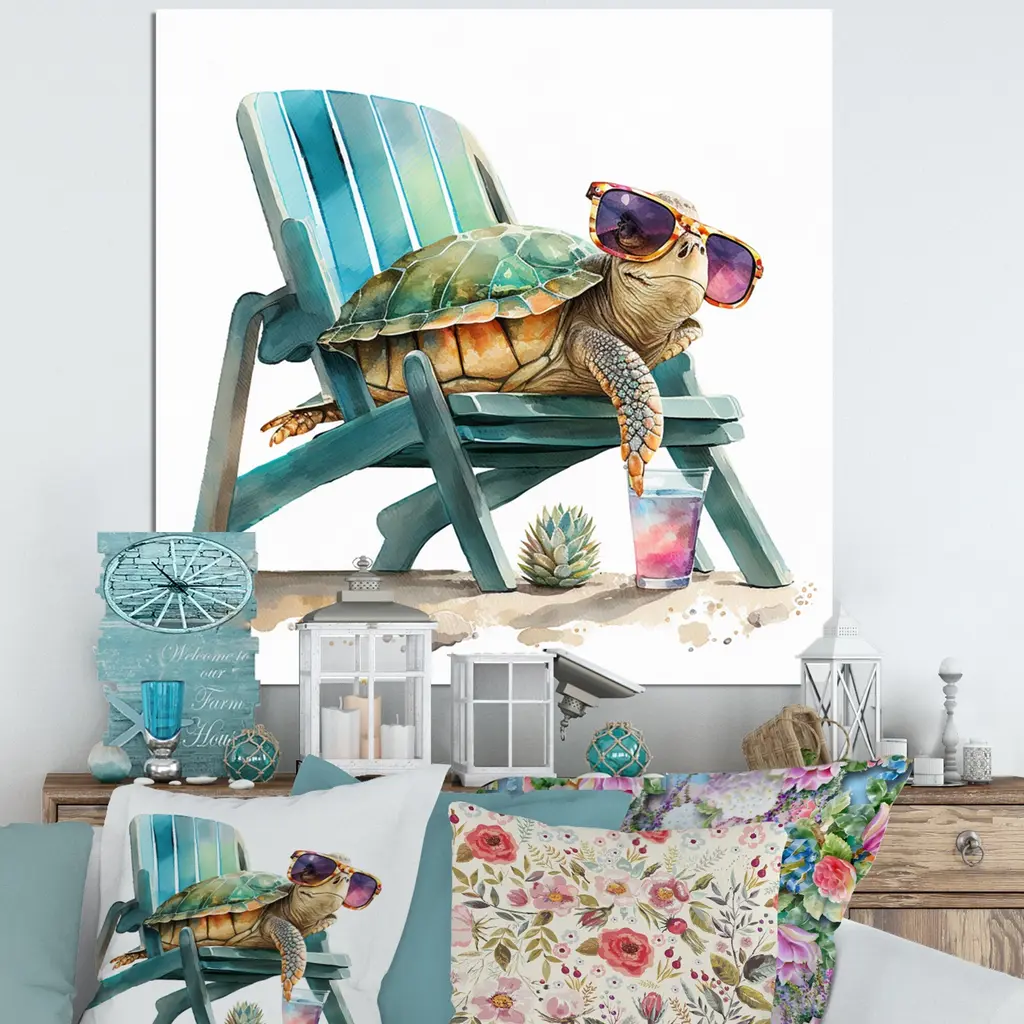 Designart 'Turtle Laying On A Beach Chair With Sunglasses I' Animals Canvas Wall Art - 24 In. Wide X 24 In. High