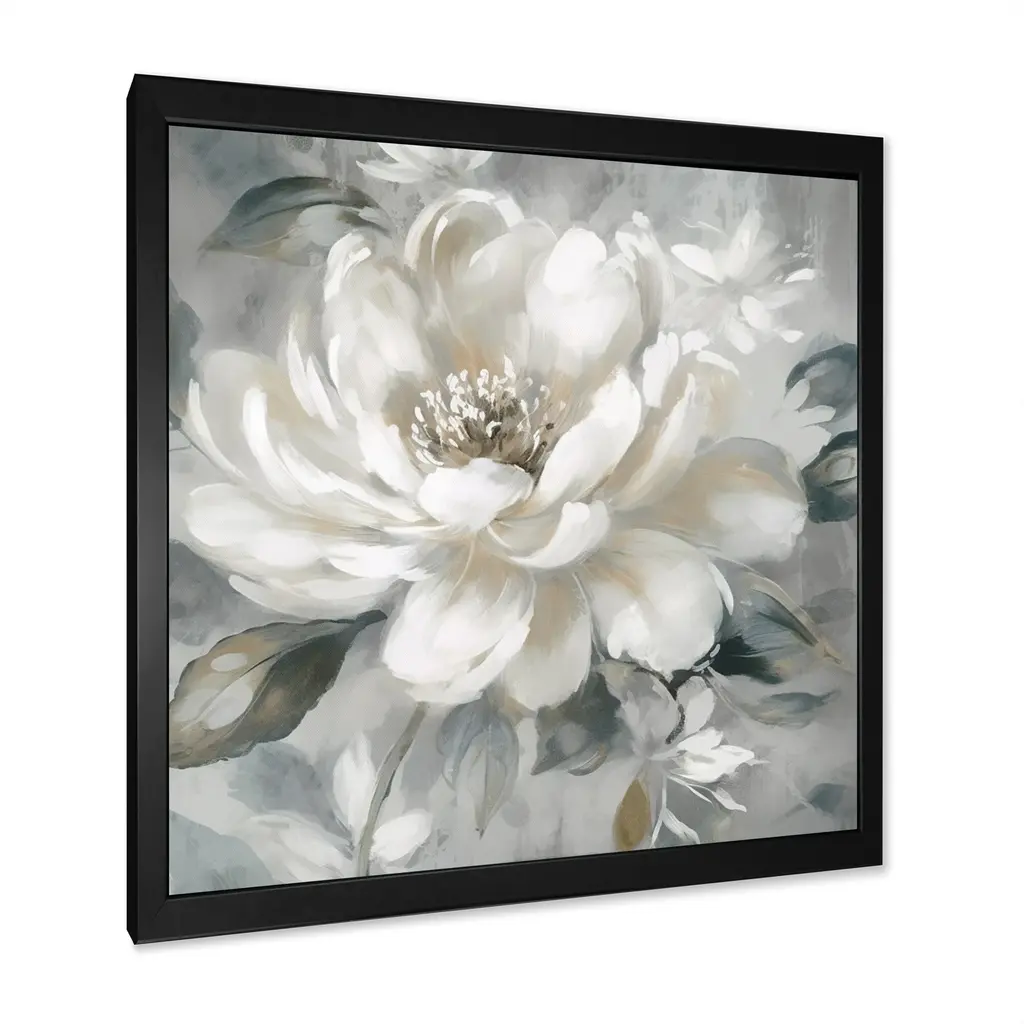 Designart "White Grey Peony Blooms In Motion I" Floral Peony Framed Canvas Art Print - 16 In. Wide X 16 In. High - Black