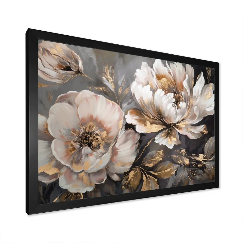 Designart "White Grey Peony Blooms In Motion Iv" Floral Peony Framed Canvas Prints - 32 In. Wide X 16 In. High - Black