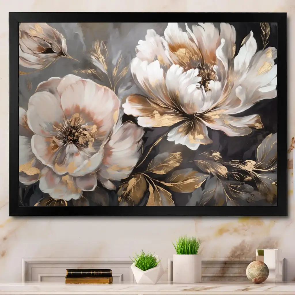 Designart "White Grey Peony Blooms In Motion Iv" Floral Peony Framed Canvas Prints - 44 In. Wide X 34 In. High - Gold