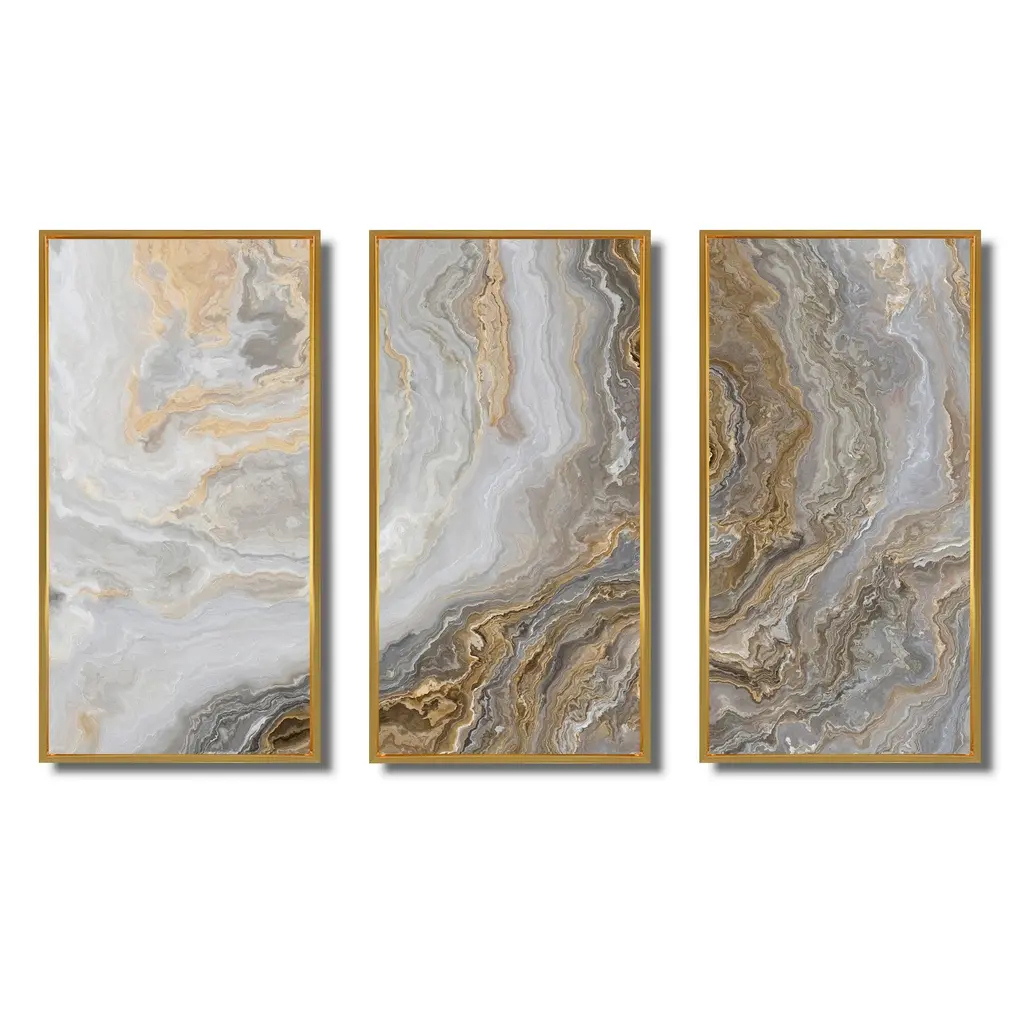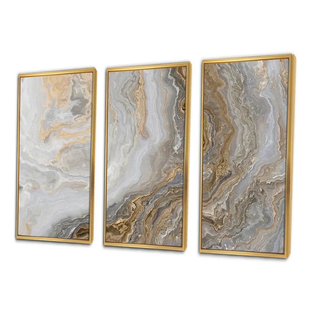 Designart "White Marble With Curley Grey And Gold Veins" Glam Framed Art Prints Set Of 3 - 4 Colors Of Frames - 36 In. Wide X 20 In. High - 3 Panels - Gold