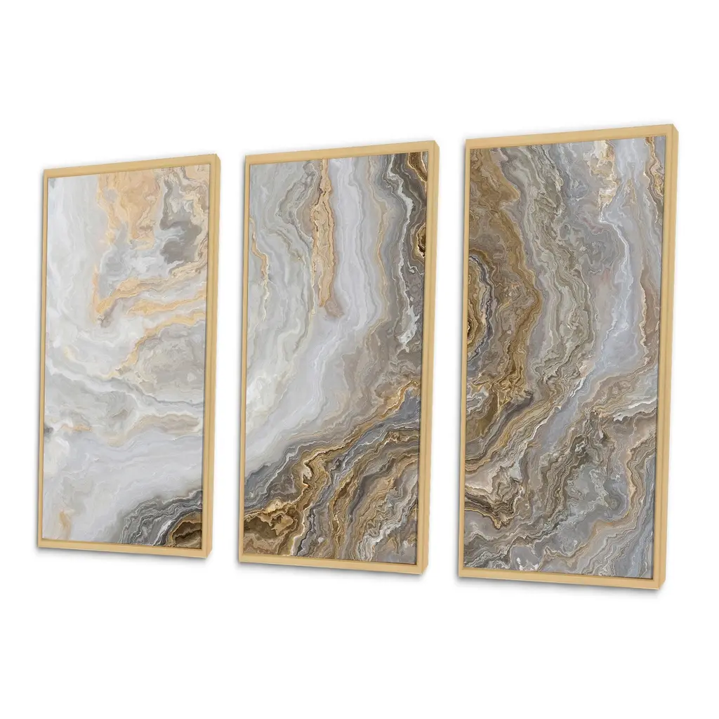 Designart "White Marble With Curley Grey And Gold Veins" Glam Framed Art Prints Set Of 3 - 4 Colors Of Frames - 36 In. Wide X 20 In. High - 3 Panels - Maple