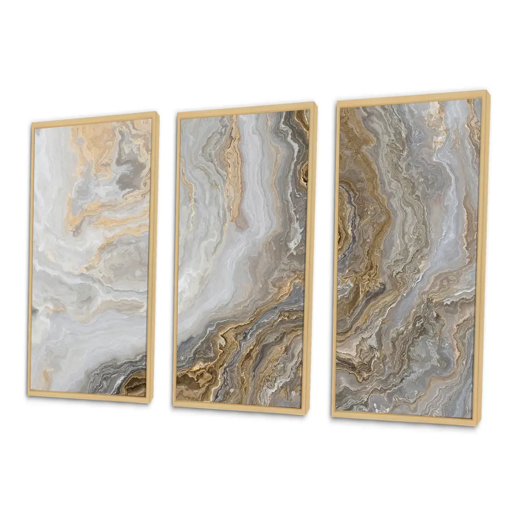Designart "White Marble With Curley Grey And Gold Veins" Glam Framed Art Prints Set Of 3 - 4 Colors Of Frames - 36 In. Wide X 28 In. High - 3 Panels - Maple