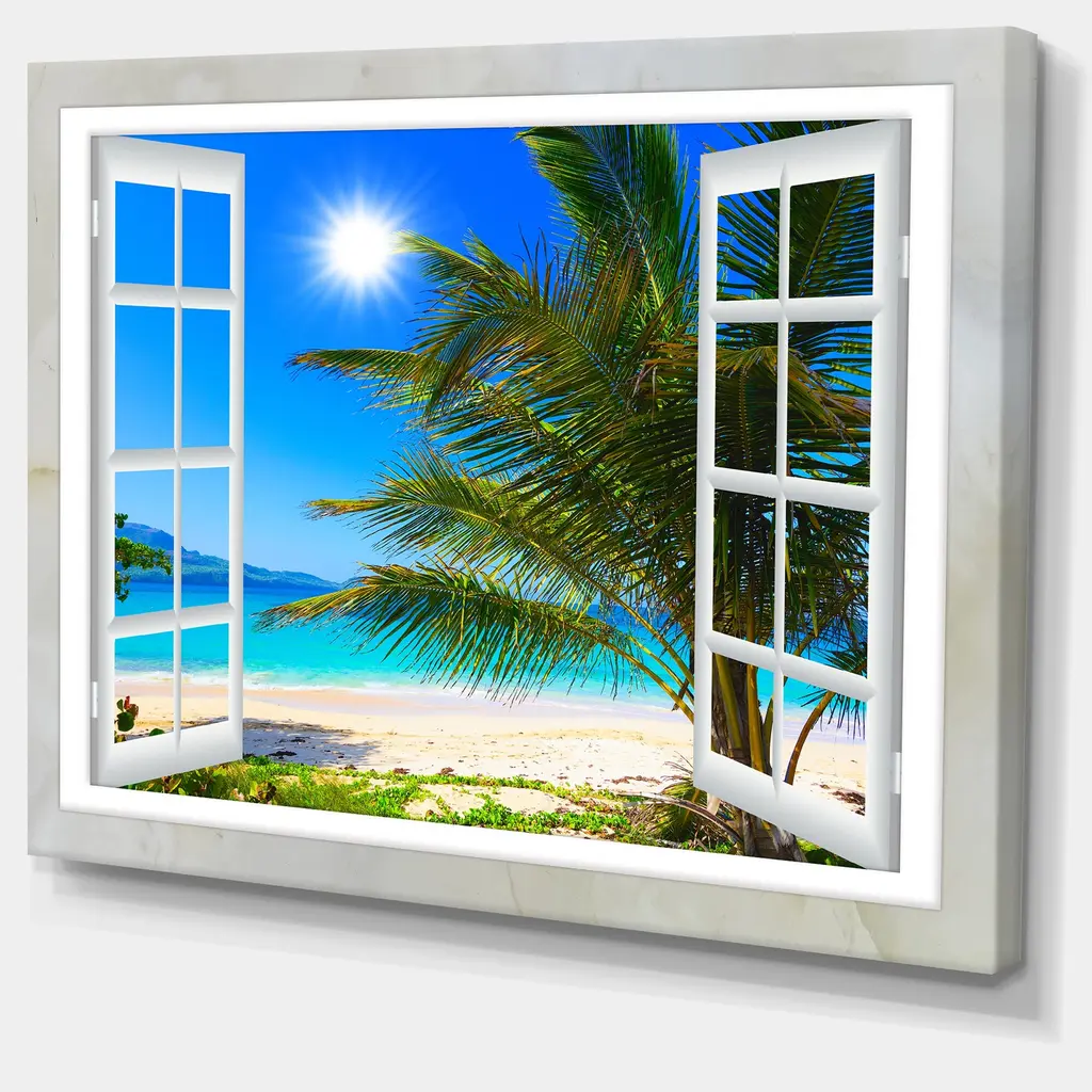 Designart "Window Open To Beach With Palm" Extra Large Seashore Canvas Art - 12 In. Wide X 8 In. High
