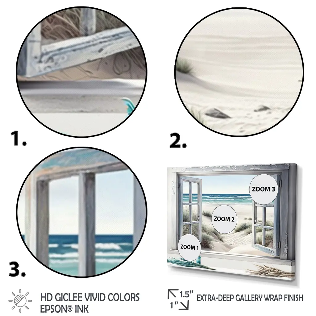 This beautiful "Window To The Beach III" Canvas Art is printed using the highest quality fade resistant ink on canvas. Every one of our fine art giclee canvas prints is printed on premium quality cotton canvas, using the finest quality inks which will not fade over time. Each giclee print is stretched tightly over a 1 inch wood sub frame for small size prints or a 1.5 inch wood sub frame for large size prints (40x30 60x28 ...) ensuring the canvas is taught and does not buckle. This canvas art print is gallery-wrapped (the design continues on the sides) , giving it a real art gallery feel. All of our canvas prints are carefully packaged with plastic protection, fragile labeling and sturdy boxes to ensure a safe delivery. Every canvas print arrives ready to hang on the wall, with the hanging kits included. - Style : Traditional - Subject : Coastal - Color : Grey, Blue - This canvas giclee print is gallery-wrapped (the design continues on the sides) , giving it a real art gallery feel. - Premium quality cotton canvas. - Arrives ready to hang on the wall - Easy to Hang