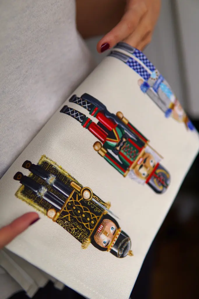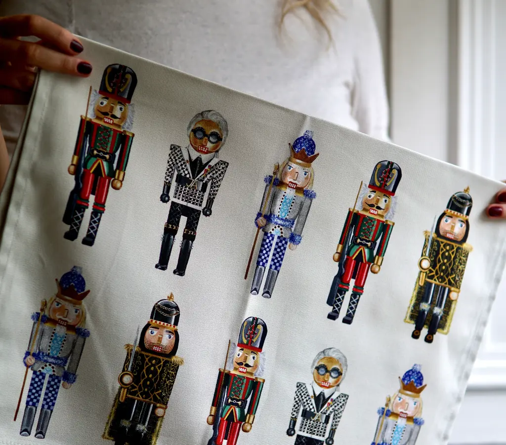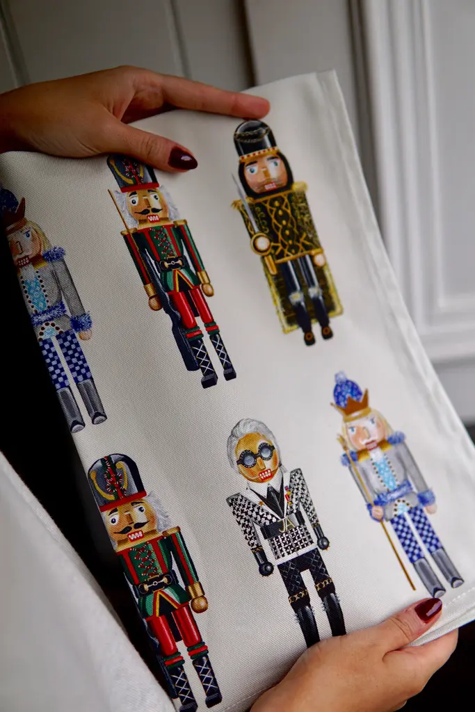 Make the ultimate festive statement with these charming Tea Towels. Inspired by Jessica's original oil paintings, these hand-painted nutcracker soldiers are dressed in vibrant colours, patterns and accessories, inspired by 4 iconic fashion houses.Jessica hand-paints each nutcracker and digitally prints them onto a durable 1/2 panama 100% cotton fabric, creating a beautifully long lasting kitchen accessory. This is a heavier weighted material, which is smooth to the touch with a solid opaque body, allowing the intricate design to be printed as detailed as possible.These unique kitchen accessories are a great way to commemorate a special occasion, as well as simply expressing your artistic taste.