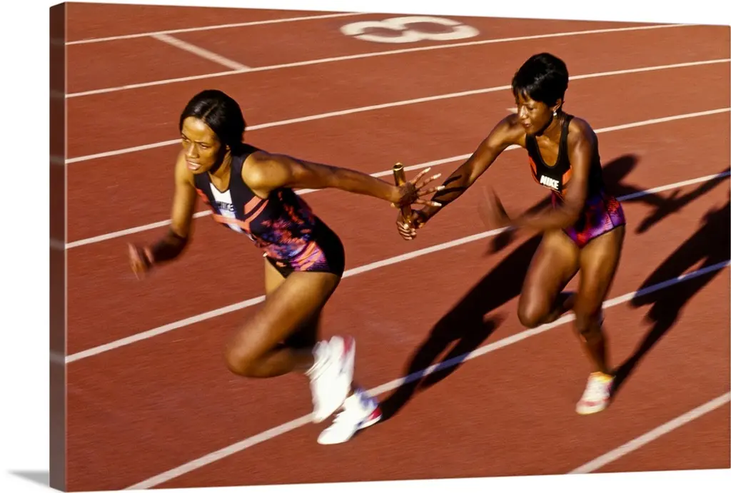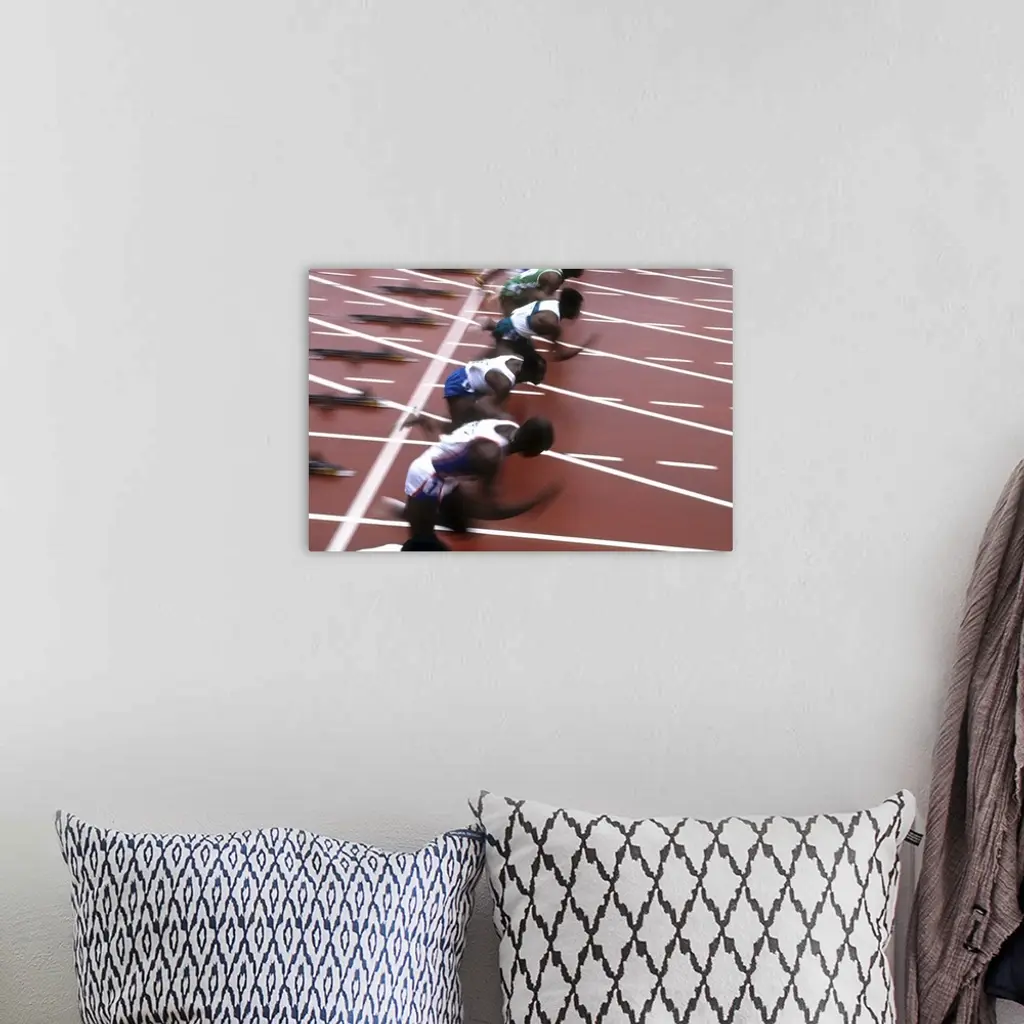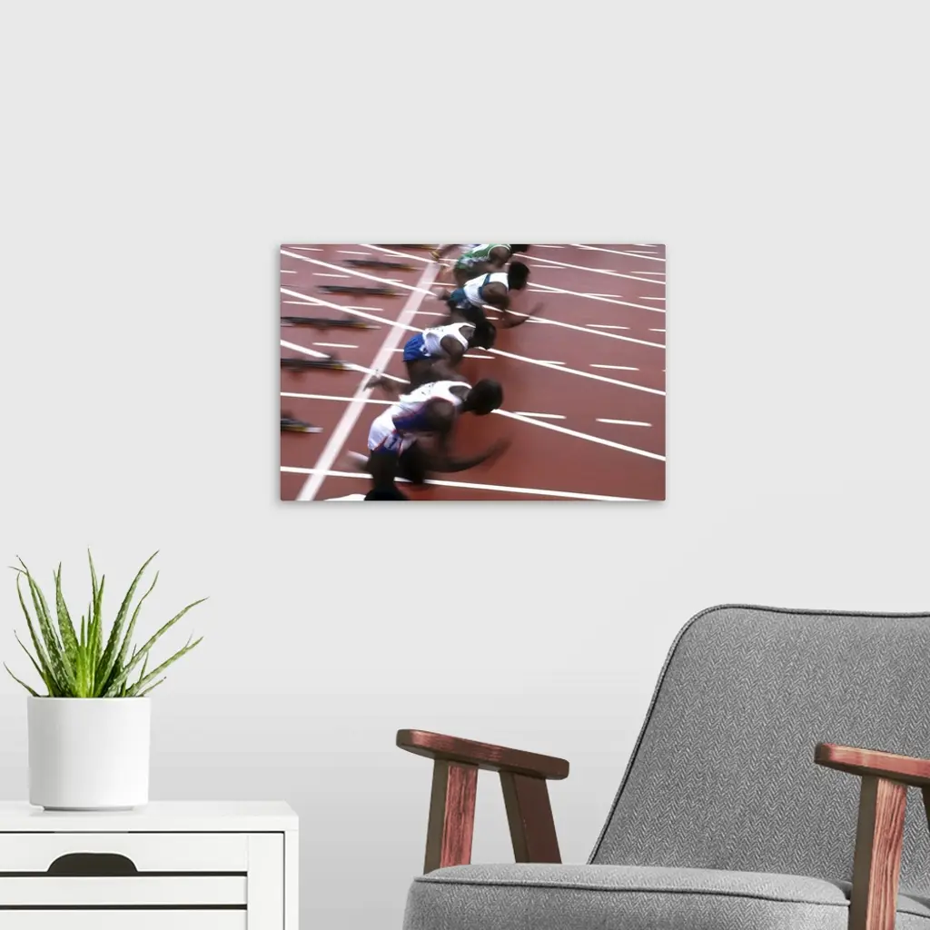 Detail of start of men's 100 meter sprint race wall art for home and office decor. Discover canvas art prints, photos, mural, big canvas art and framed wall art in GreatBigCanvas.com's varied collections.