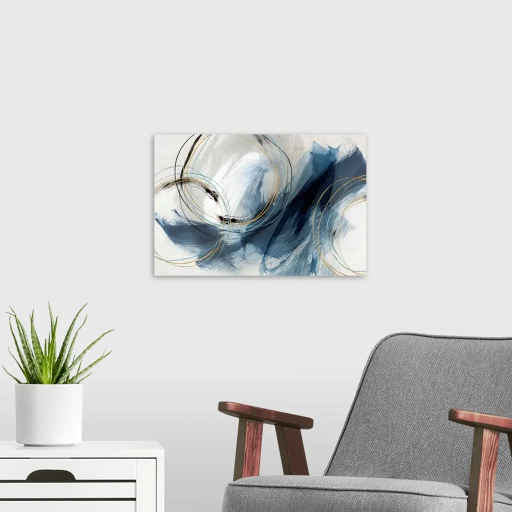 Abstract painting with large blue brushstrokes and circular lines accented with gold.