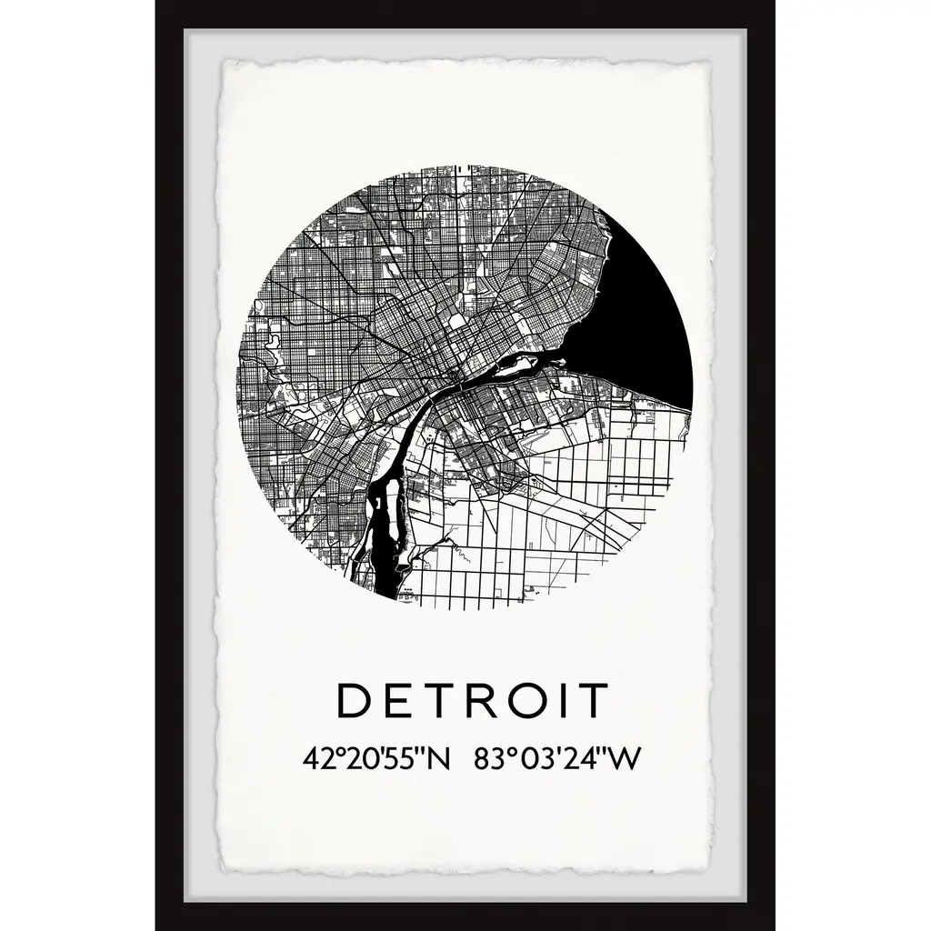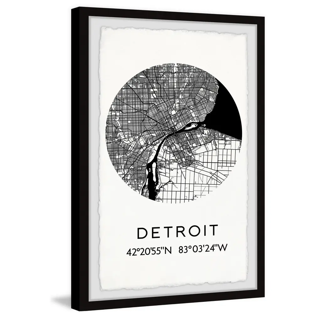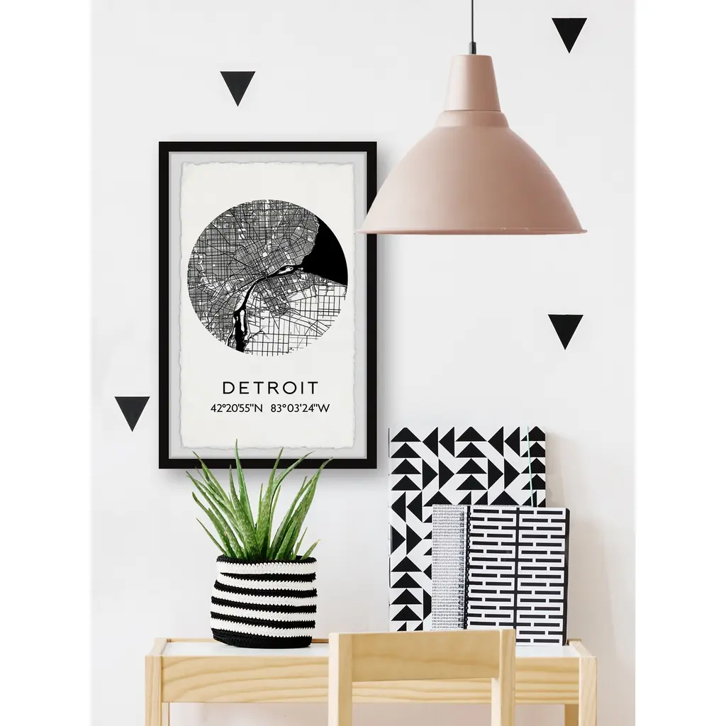 This print shows appreciation for The Motor City, featuring a black and white map of Detroit and its coordinates on the map. Proudly printed in the USA, this piece is printed on high quality archive paper and professionally hand-framed. With wall-mounting hooks included, this artful accent is ready to hang up as soon as it reaches your front door. • Top quality Giclee print on high resolution Archive Paper • Hand cut deckled edges • High quality durable non-warping frame • Finished under shatter resistant plexiglass • Arrives ready to hang • Includes a certificate of authenticity • Printed in the USA