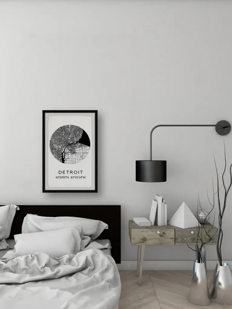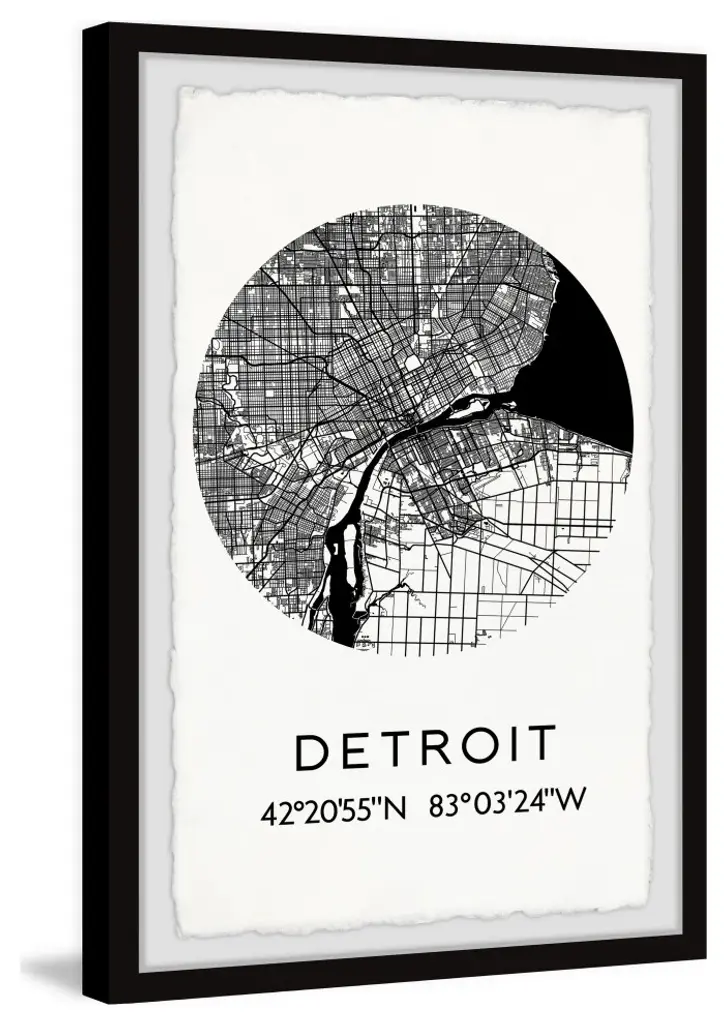 This print shows appreciation for The Motor City, featuring a black and white map of Detroit and its coordinates on the map. Proudly printed in the USA, this piece is printed on high quality archive paper and professionally hand-framed. With wall-mounting hooks included, this artful accent is ready to hang up as soon as it reaches your front door.- Top quality Gicle print on high resolution Archive Paper- Hand cut deckled edges- High quality durable non-warping frame- Finished under shatter resistant plexiglass- Arrives ready to hang- Includes a certificate of authenticity- Printed in the USA